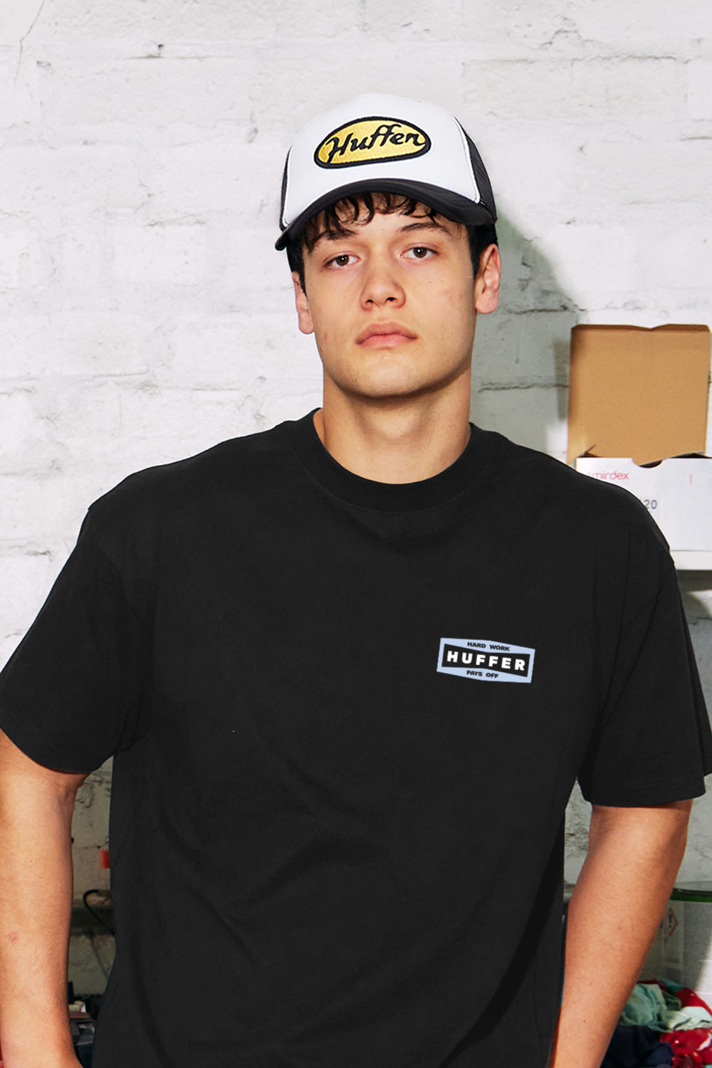 • What you need to know: 100% Polyester, trucker cap, structured, snap back closure, curved peak, mesh back panels with Huffer branded embroidery