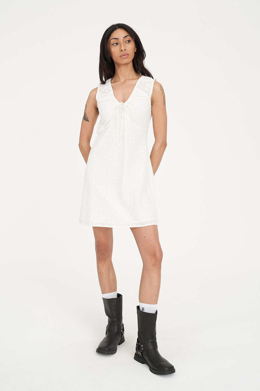 • What you need to know: 100% Cotton, 90gsm, Broderie anglaise, V shape gathered neckline with adjustable tie, Bias cut skirt, Mini length, Huffer branded placement embroidery