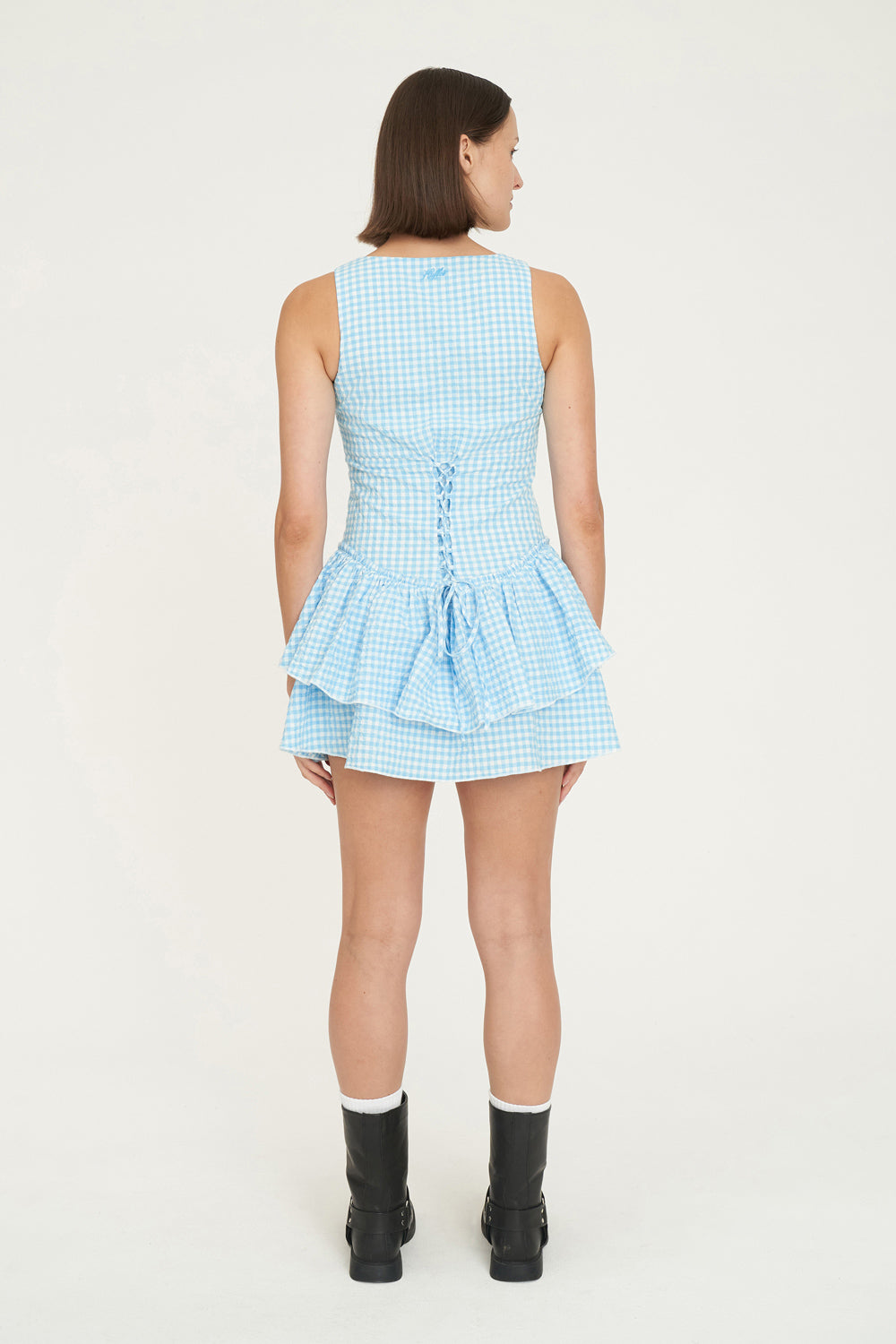 • What you need to know: 95% Cotton 5% Elastane, 140gsm, Custom Huffer gingham, Lace trim bodice, Lace up back detail, Tiered skirt, Mini length, Huffer branded placement embroidery
