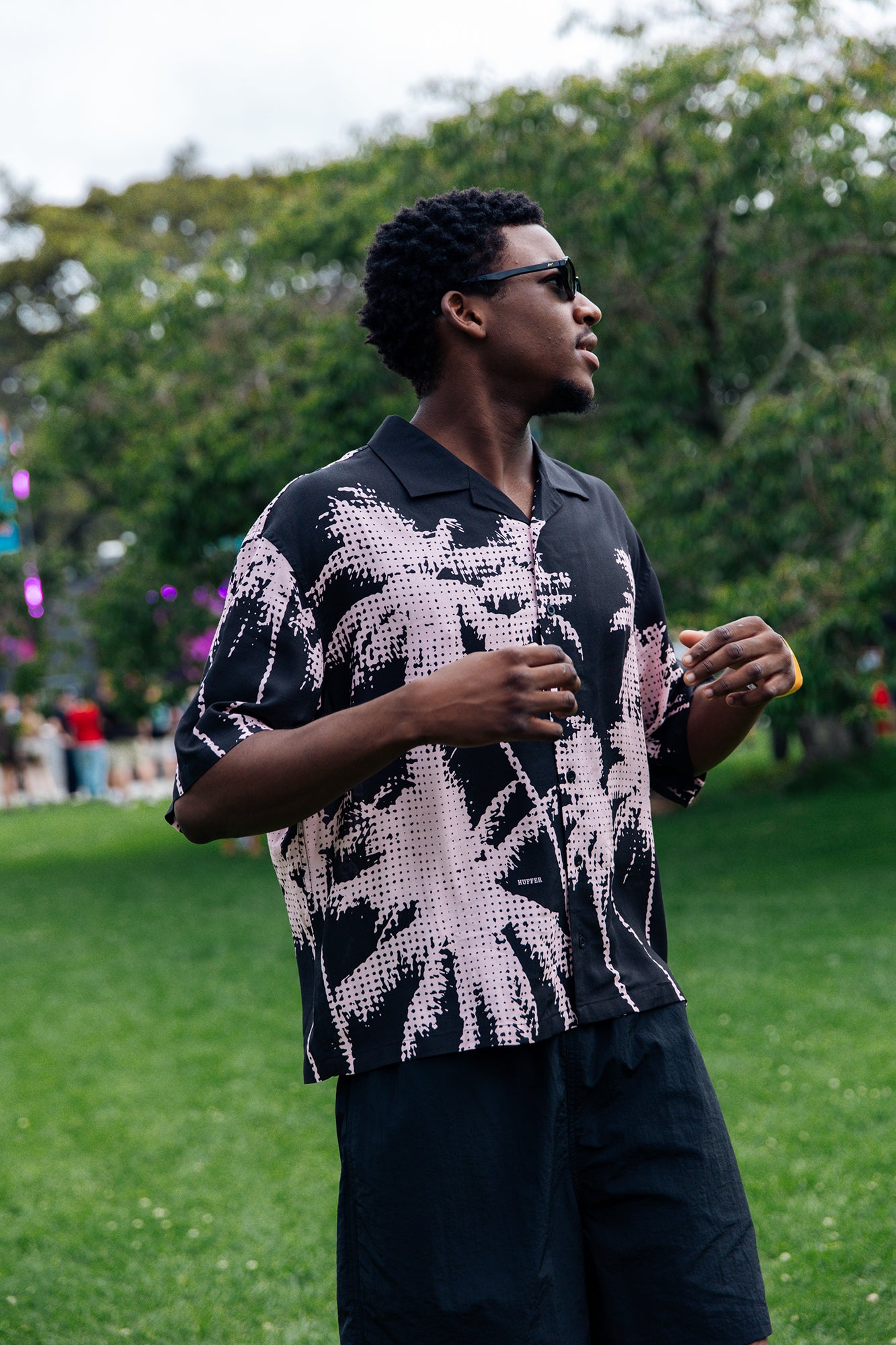 • What you need to know: 100% Viscose, 160gsm, Custom Huffer print, Short sleeves, Relaxed fit, Crop length, Camp collar, Huffer branded buttons