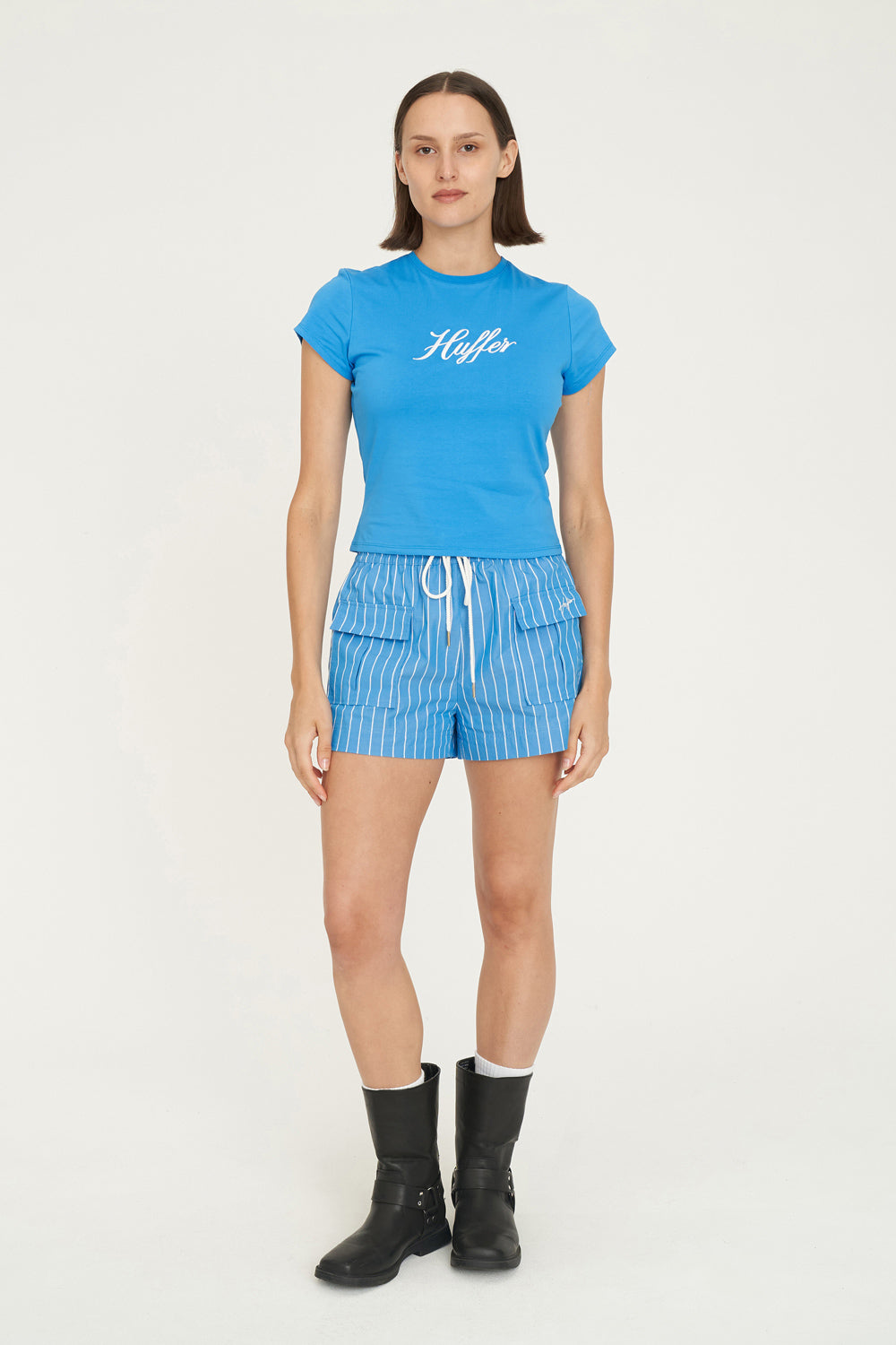 • What you need to know: 100% Cotton Pinstripe, 120gsm, Relaxed fit, Elasticated waistband w drawcord, Patch pockets, Huffer branded hardware, Huffer placement embroidery
