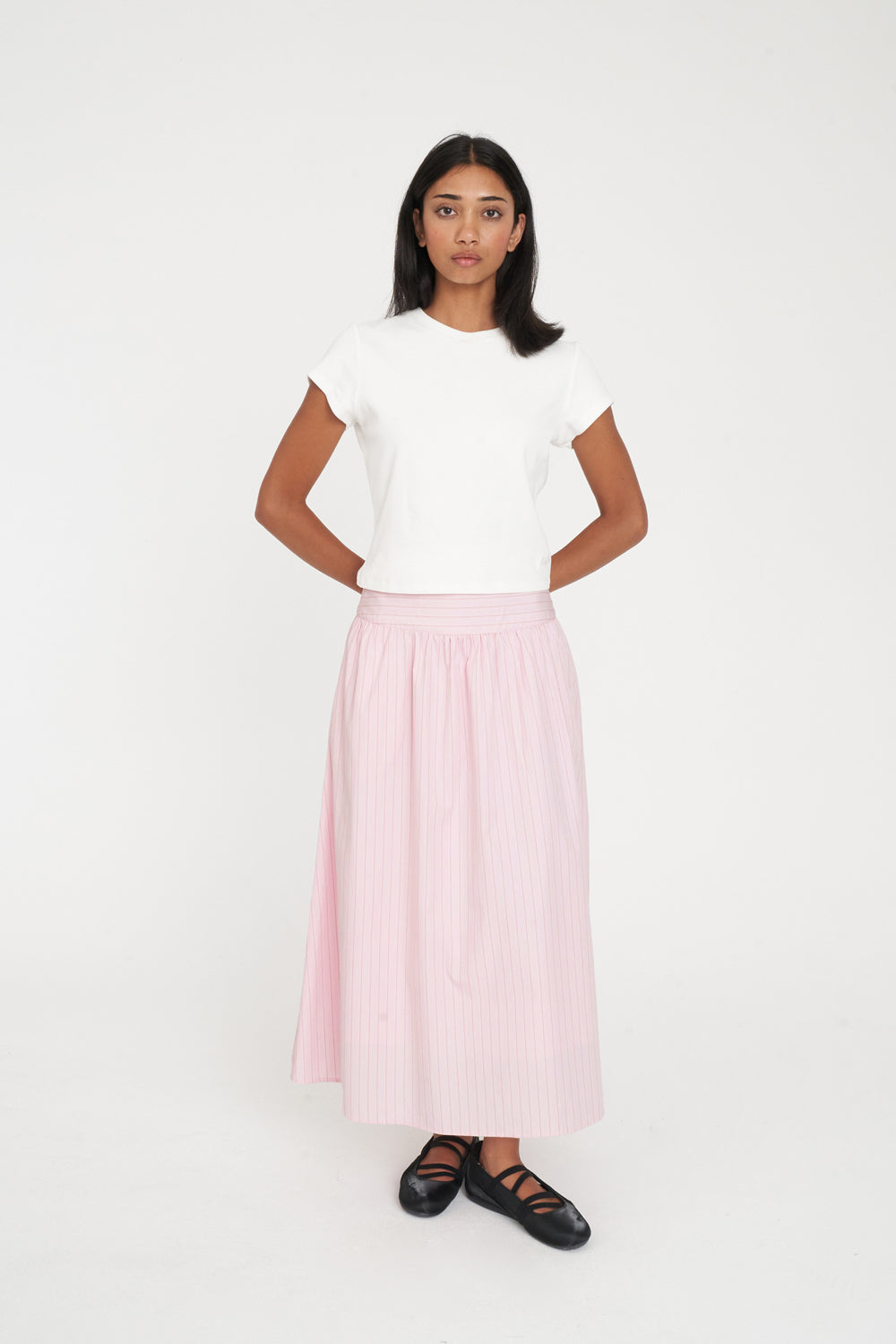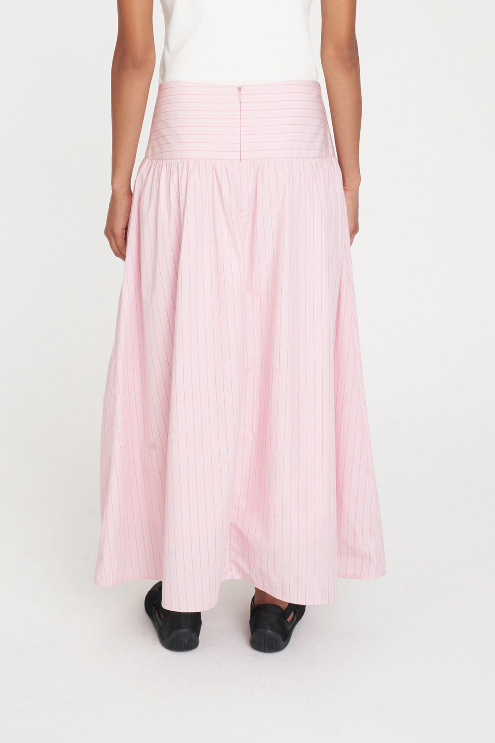 • What you need to know: 100% Cotton Pinstripe, 110gsm, Fixed waistband, concealed zip closure at centre back, Side pockets, Maxi length