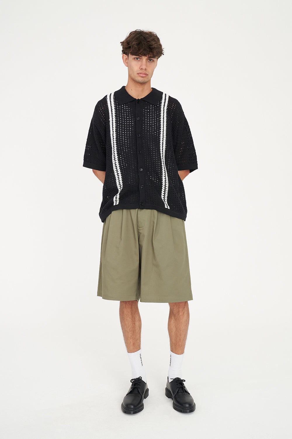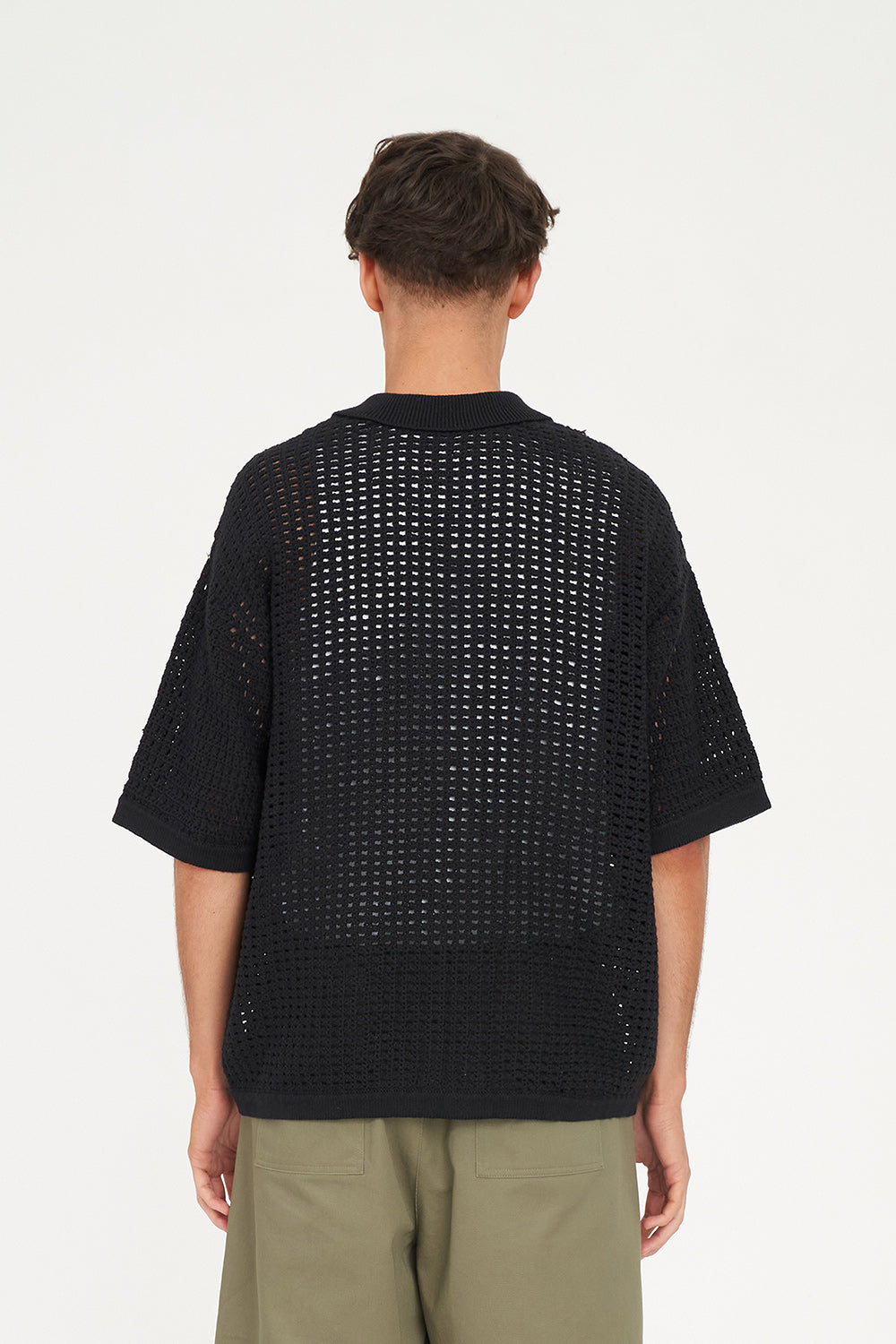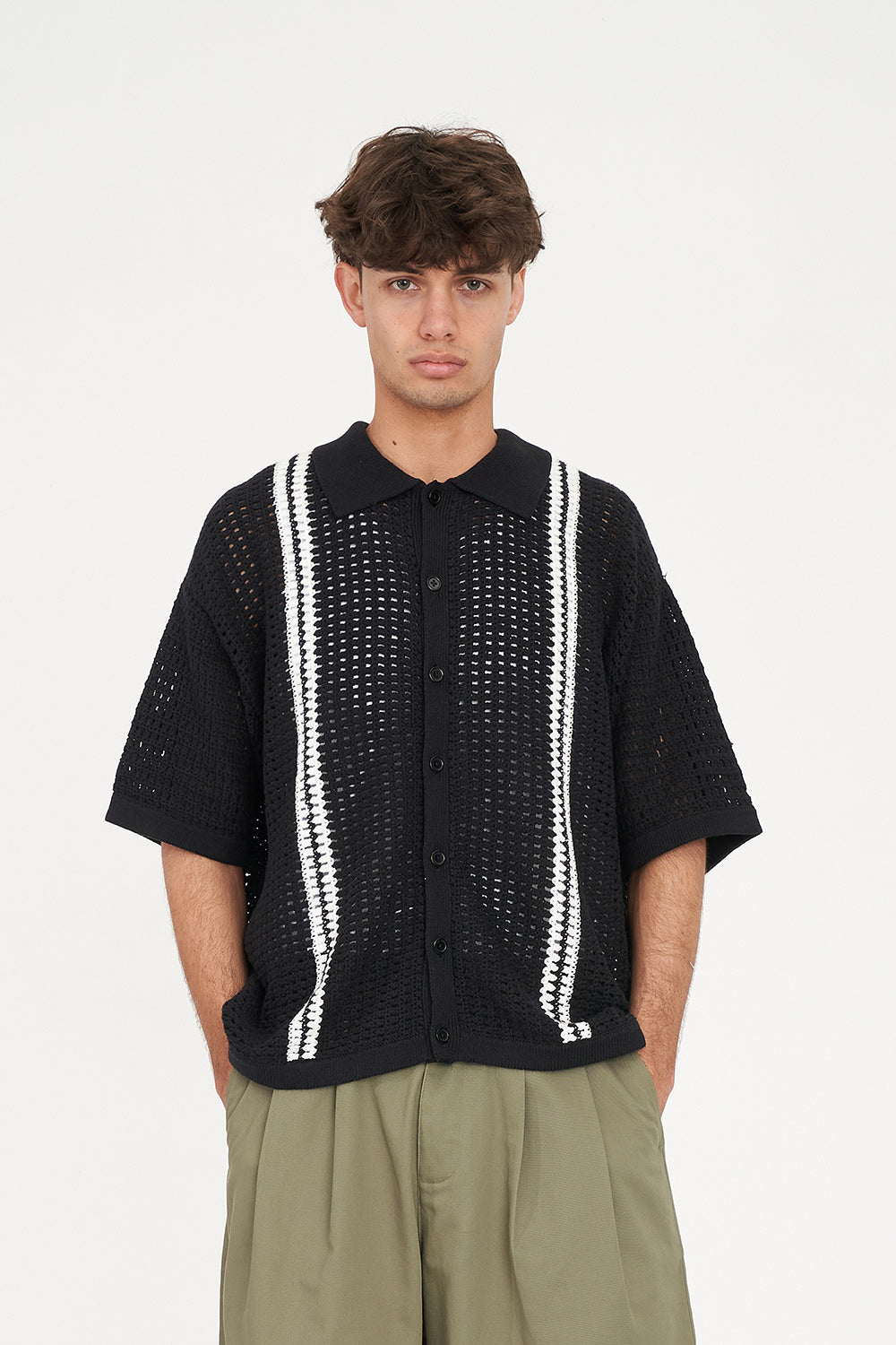 • What you need to know: 60% Cotton 40% Acrylic, Fully fashioned, Boxy streetwear fit, Short sleeve, Button front closure, Huffer branded buttons, Huffer branded woven pip