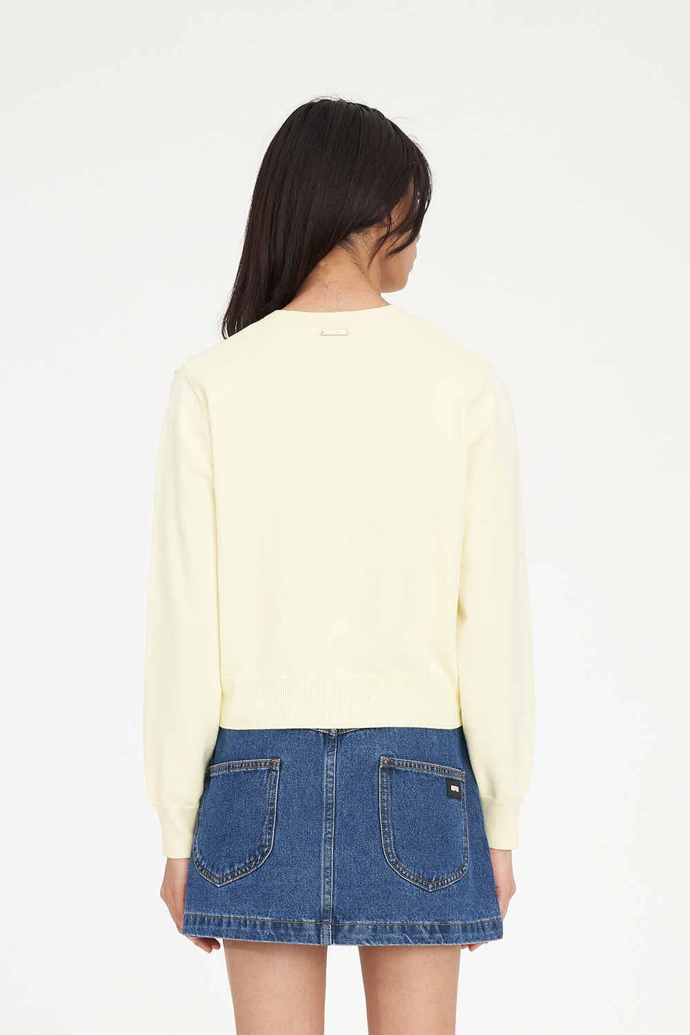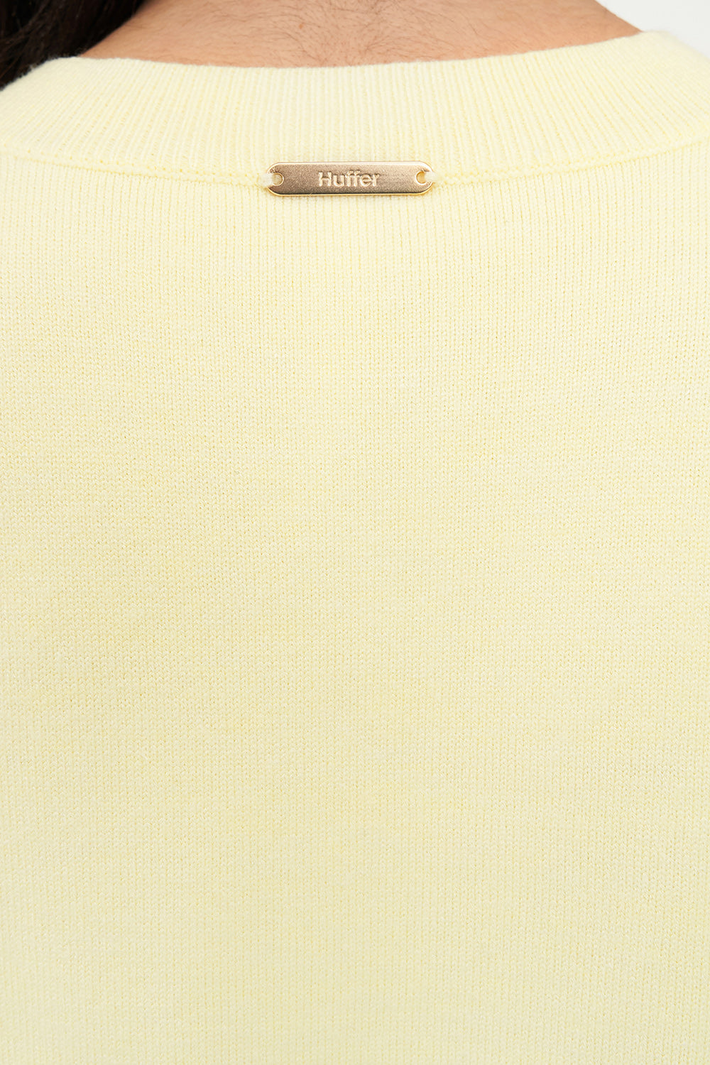 • Soft, structured, and ready to turn heads without even trying. BR>• What you need to know: 50% viscose, 22% nylon, 28% PBT, fully fashioned knit, jersey stitch body and sleeves, 1x1 rib neckband, hem and cuffs, button tab, round neck, Huffer knitwear metal plate.