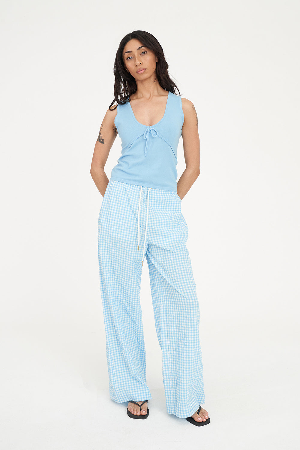 • What you need to know: 50% Viscose 28% Polyester 22% Nylon, Fully fashioned jersey knit, V-neck with scalloped edges, Front tie, Huffer branded gold metal plate