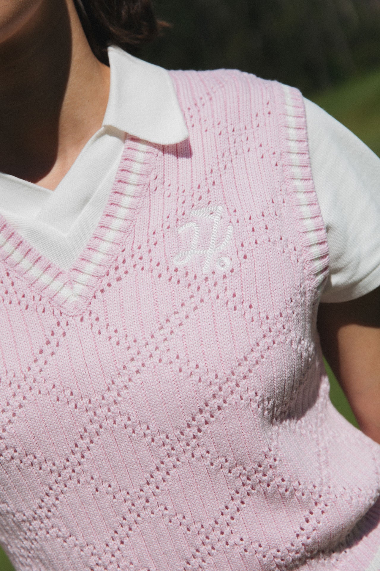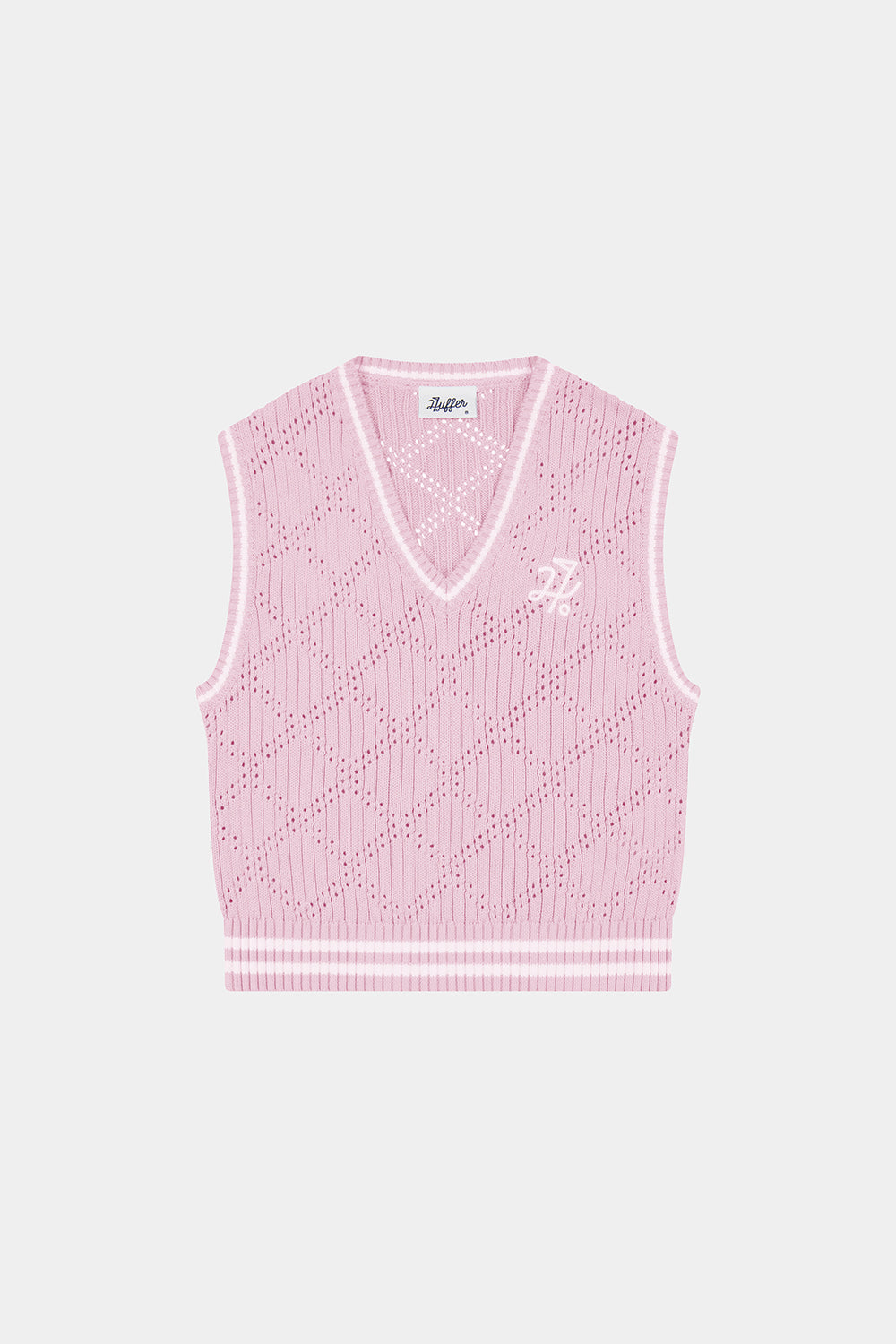 • Here's what you should know: 100% Cotton, Fully fashioned knit, Sleeveless, V neck, Crop length, Huffer placement embroidery, Huffer woven badge