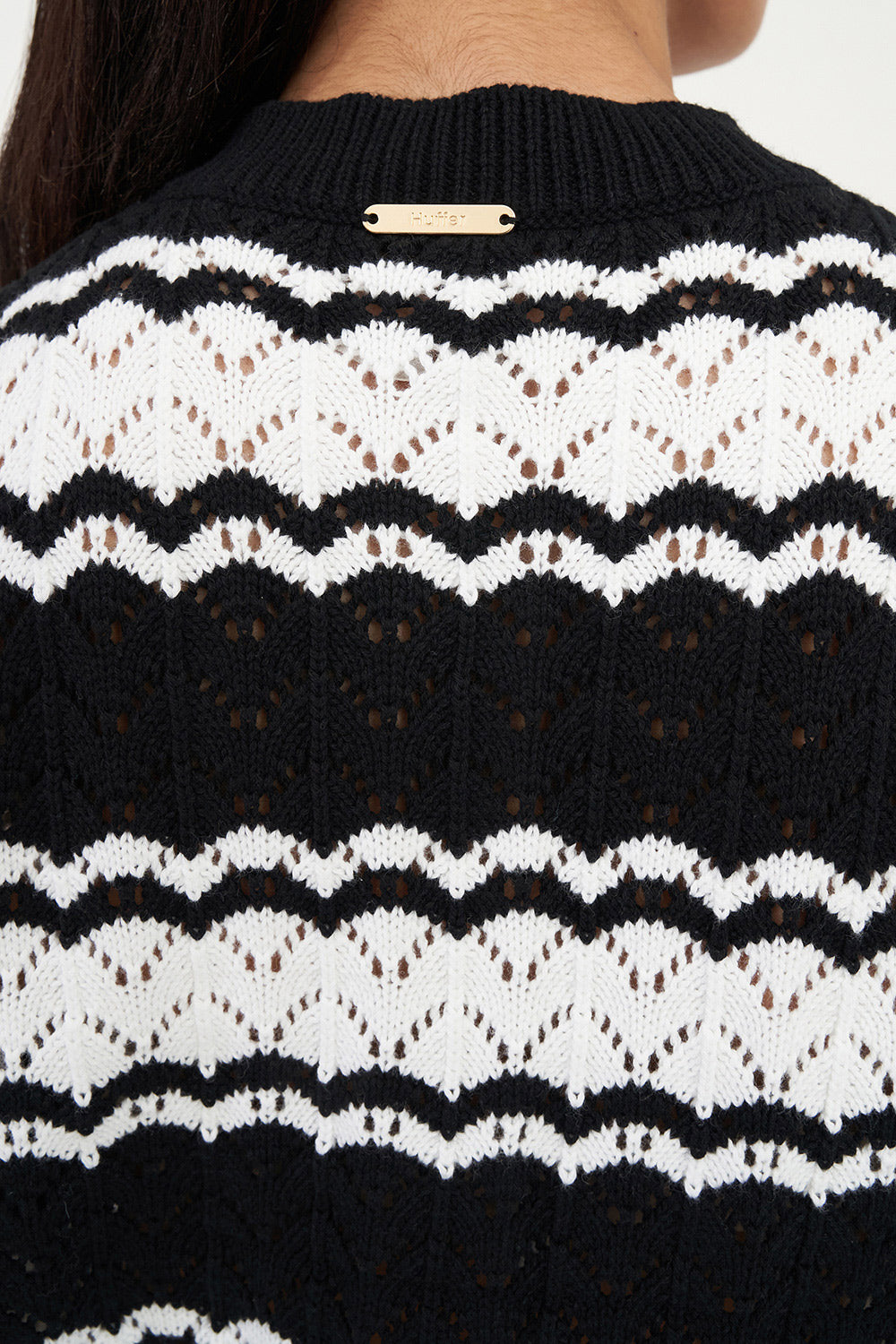 • What you need to know: 100% cotton, Fully fashioned knit, lace knit structure, Round neck, Loose fit, Crop length, Huffer branded gold metal plate, Huffer embossed buttons