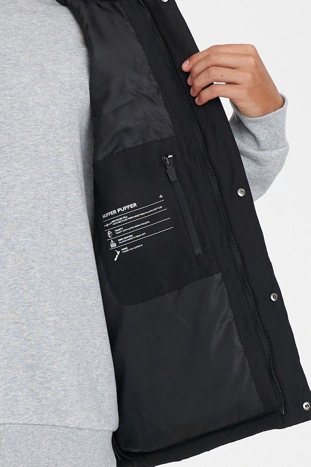 Main: 100% Polyester, Lining: 100% Polyester, Fill: 100% REPREVE Recycled Polyester made from plastic bottles found in the environment / Peach finish / Classic fit / Durable water resistant coating / Custom Huffer printed lining / YKK Zips /