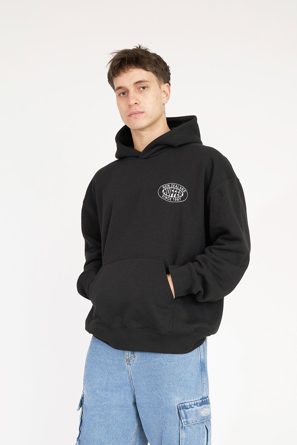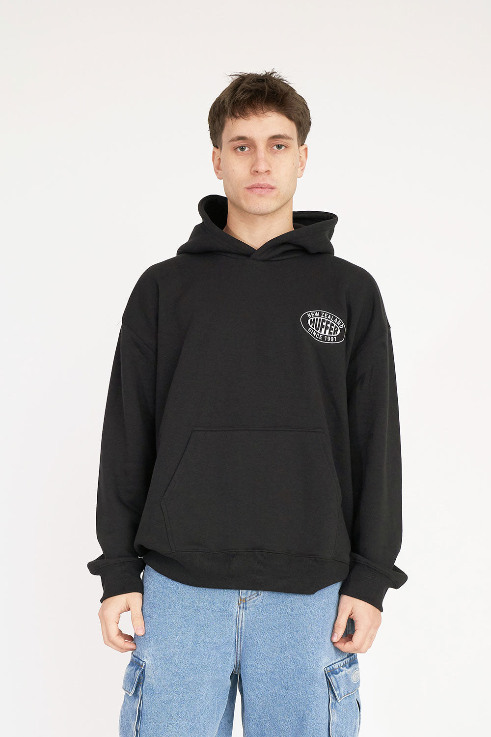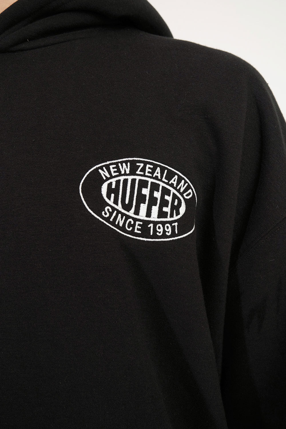 • What you need to know: 100% cotton, 350gsm mid-weight brushback fleece, custom Huffer colour, boxy fit, kangaroo pocket, Huffer branded hardware, Huffer branded embroidery.