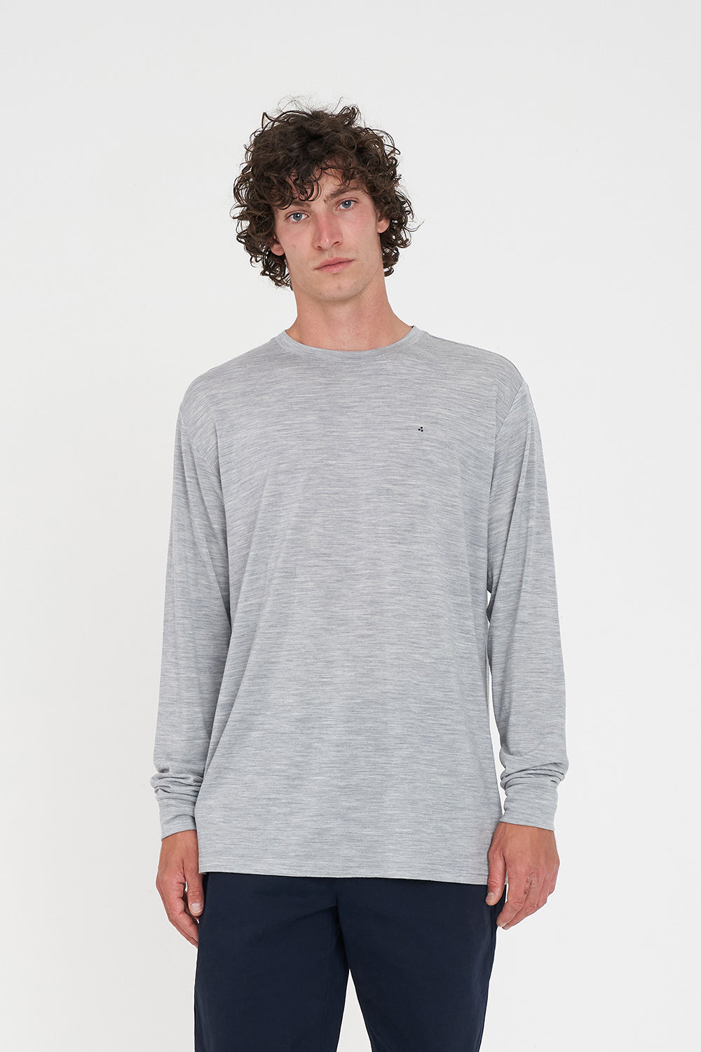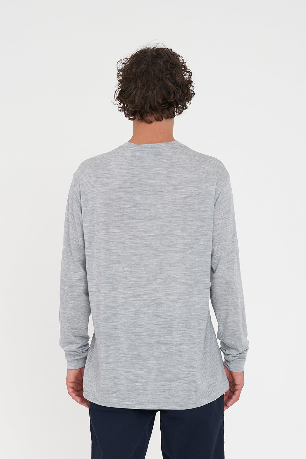 • What you need to know: 91% Merino 9% Nylon, 180gsm, 20mm Neck rib, Durable core spun merino, Classic fit, Long sleeve, Huffer branded placement print