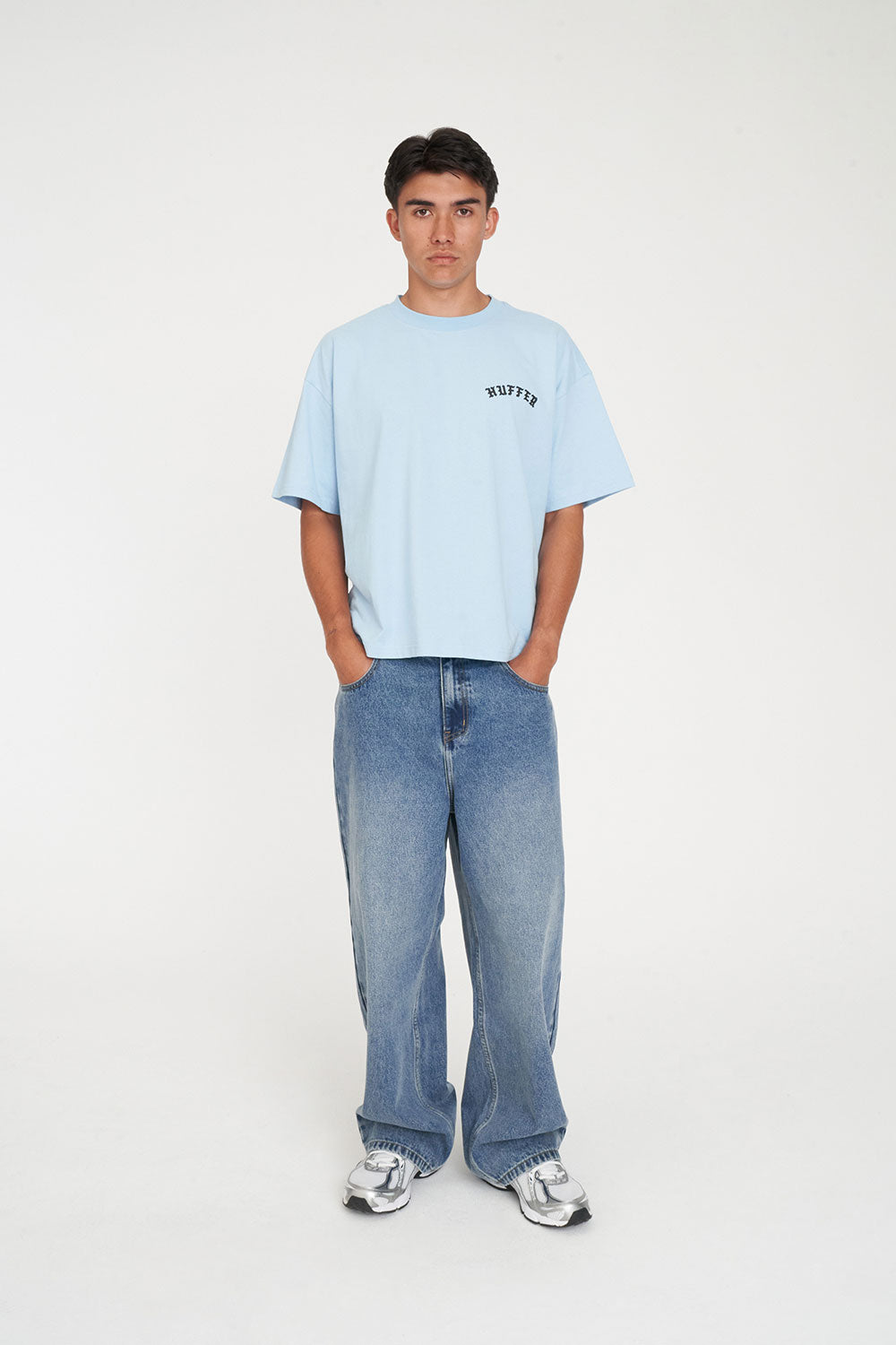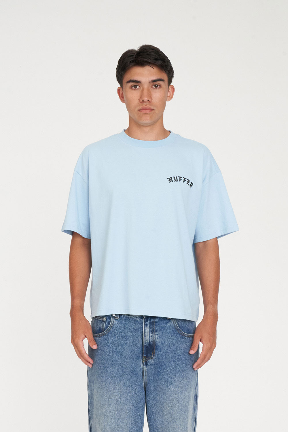 • What you need to know: 100% Cotton, 220gsm, 25mm Neck rib, Boxy cropped fit, Short sleeve, Huffer branded placement screenprint & puff print
