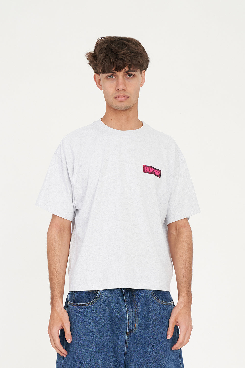 • What you need to know: 100% Cotton, 220gsm, 25mm Neck rib, Premium weight jersey, Boxy fit, Short sleeve, Huffer branded placement screenprint