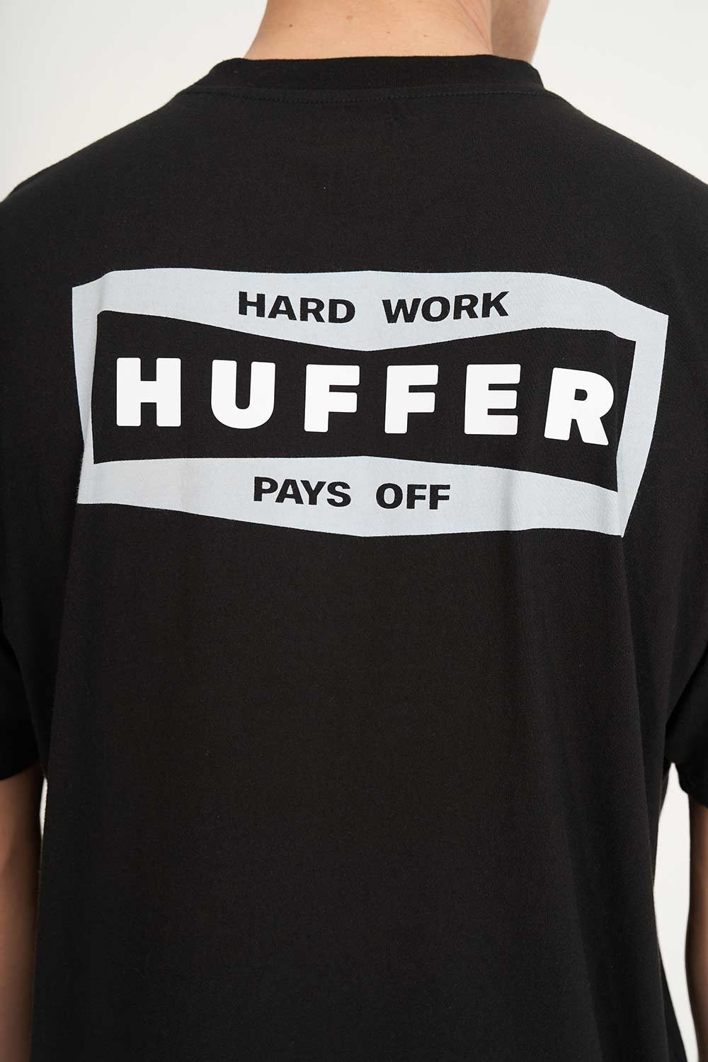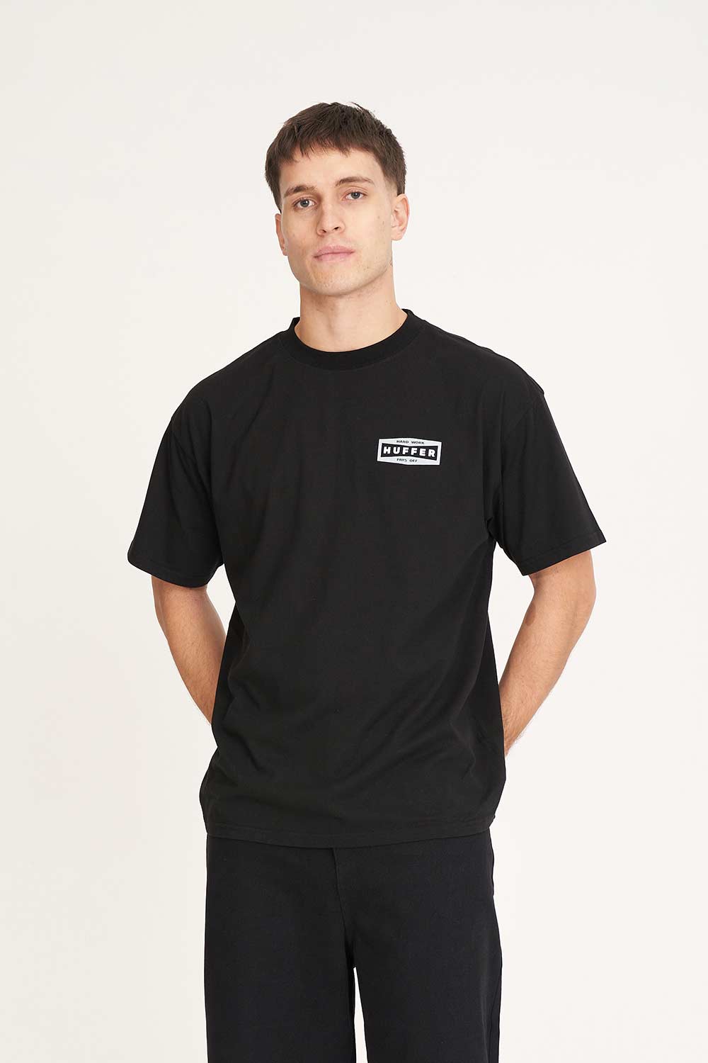 • What you need to know: 220gsm 100% Cotton, 25mm neck rib, premium weight jersey, boxy fit, short sleeve with Huffer branded screenprint