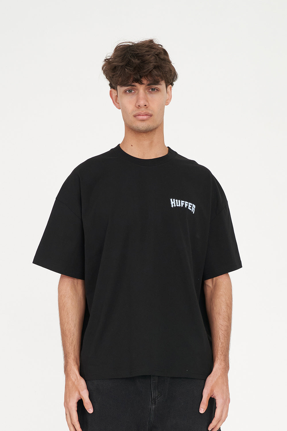 • What you need to know: 100% Cotton, 220gsm, 25mm Neck rib, Premium weight jersey, Boxy fit, Short sleeve, Huffer branded placement screen & puff print