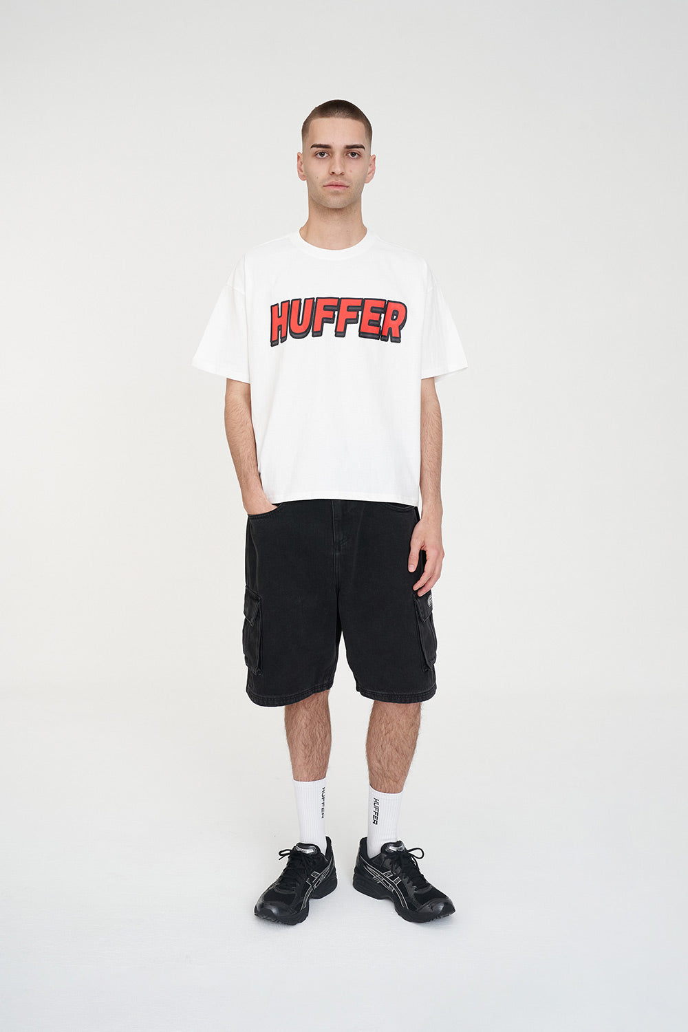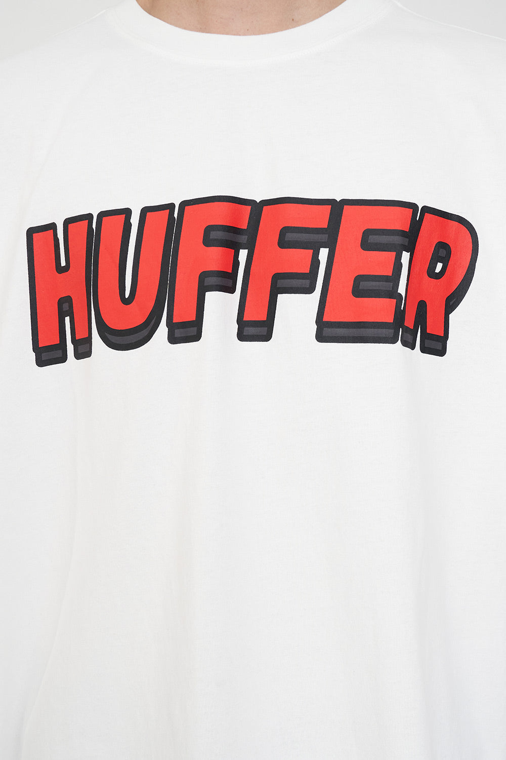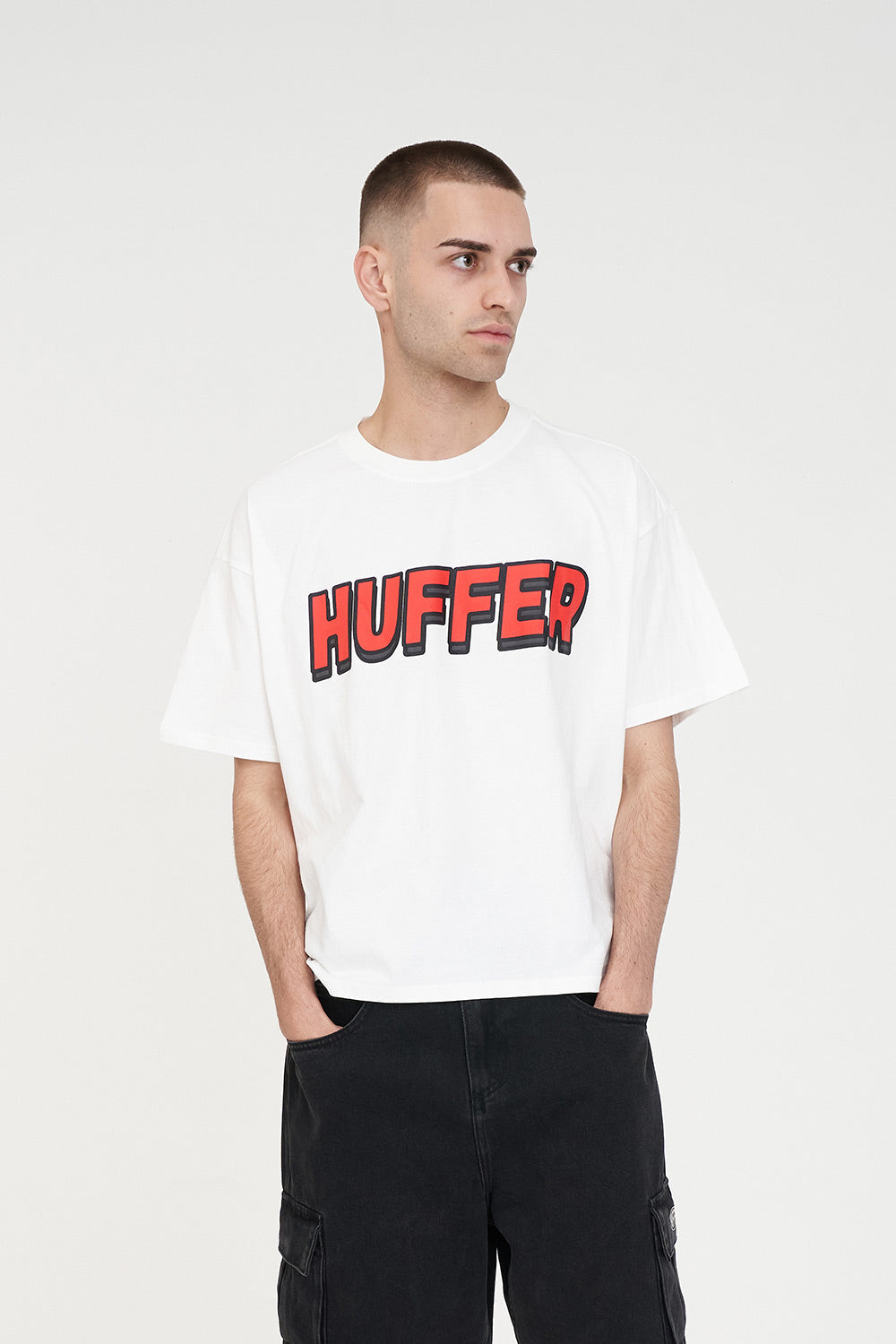 • What you need to know: 100% Cotton, 190gsm, 20mm Neck rib, Classic streetwear fit, Short sleeve, Huffer branded placement screenprint