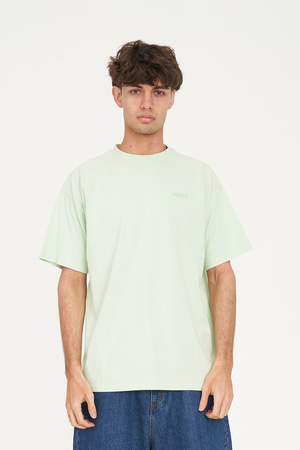 • What you need to know: 100% Cotton, 220gsm, 25mm Neck rib, Premium weight jersey, Garment dyed, Boxy fit, Short sleeve, Huffer branded tonal flocking patch