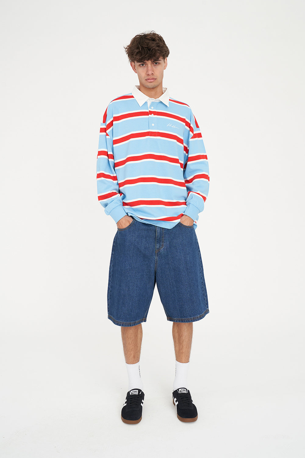 • What you need to know: 100% Cotton, 280gsm, Rugby knit, Boxy oversized fit, Contrast drill collar, Ribbed cuffs, Long sleeve, Huffer branded placement embroidery
