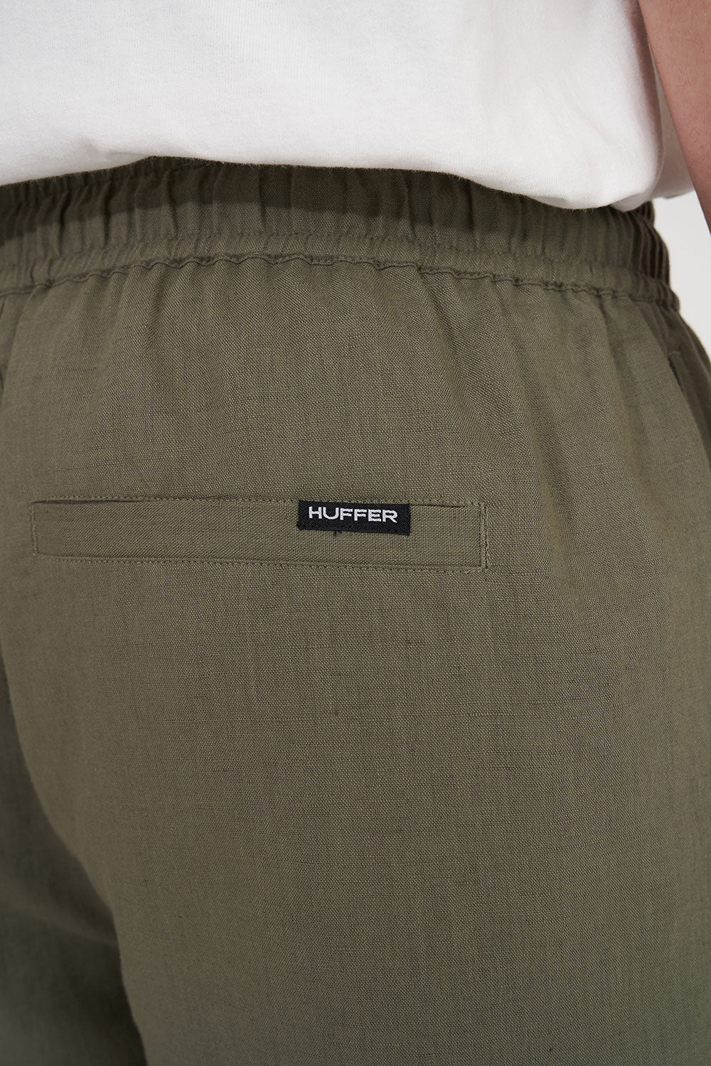 • What you need to know: 150gsm 55% Cotton 45% linen, custom Huffer colour, relaxed fit, 4 pocket detail, elasticated waistband with drawcord and Huffer branded woven label