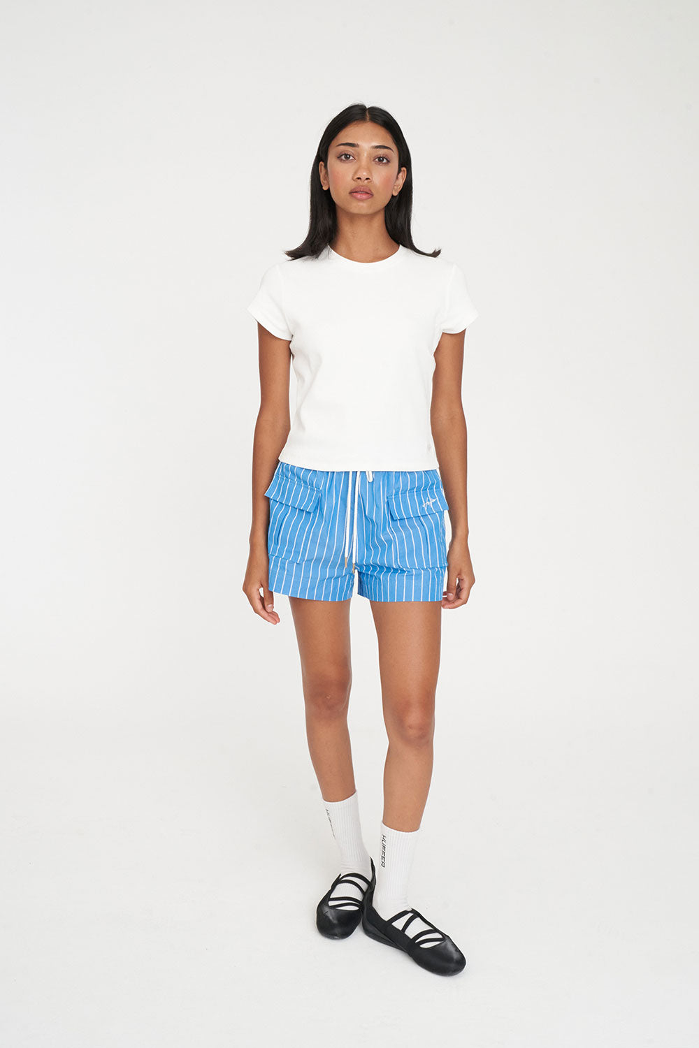 • What you need to know: 100% Cotton Pinstripe, 120gsm, Relaxed fit, Elasticated waistband w drawcord, Patch pockets, Huffer branded hardware, Huffer placement embroidery