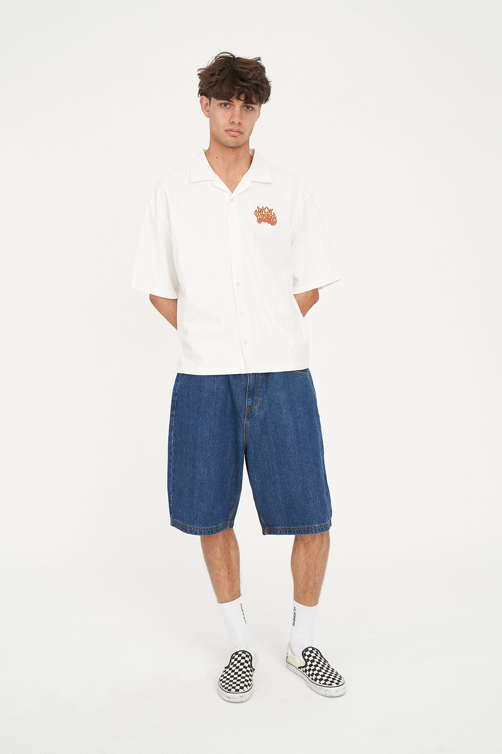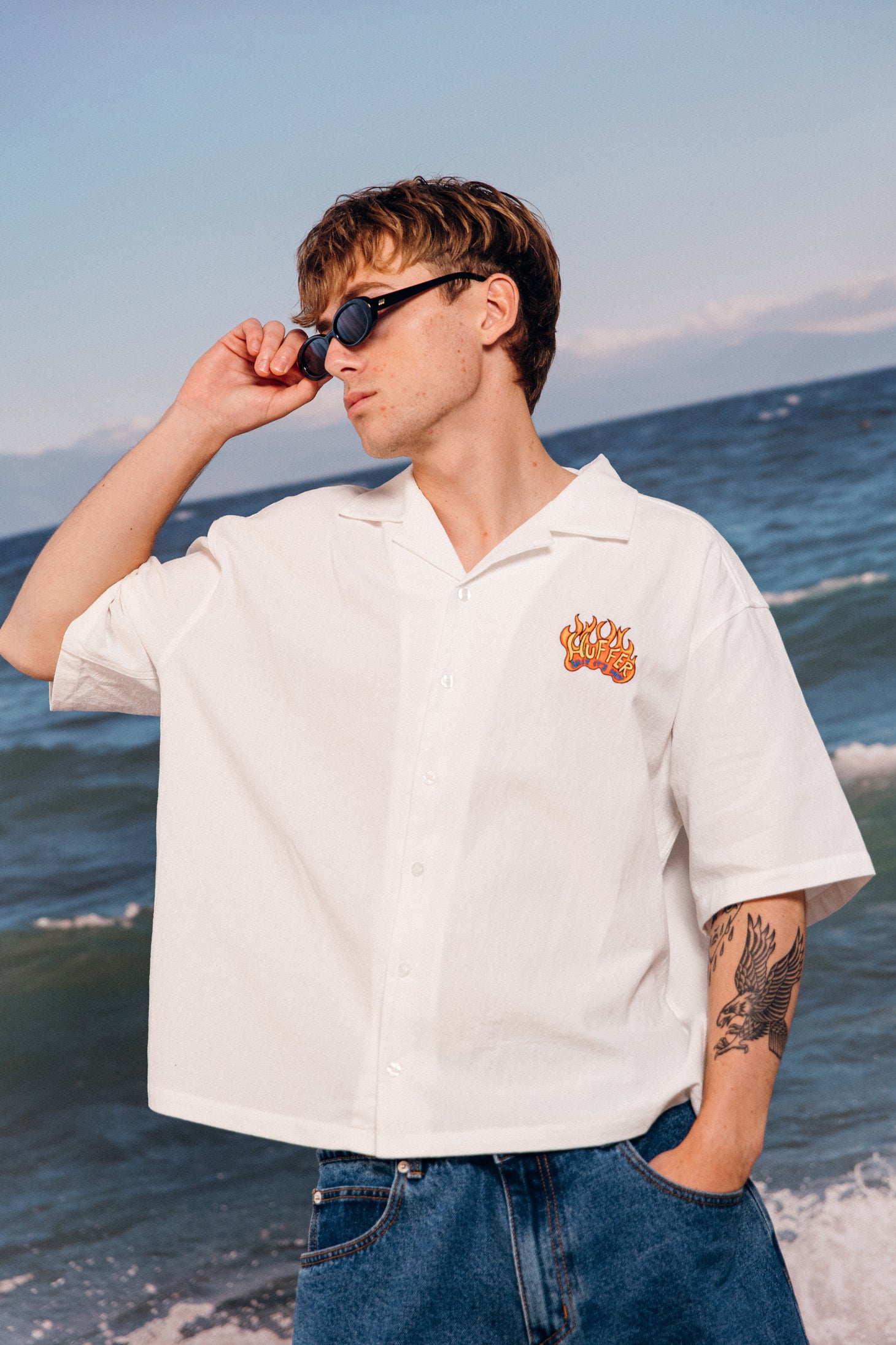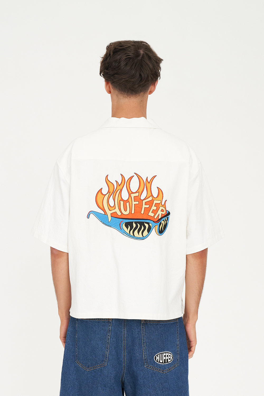 • What you need to know: 100% cotton, 170gsm, Short sleeve, Relaxed fit, Camp collar, Huffer branded buttons, Huffer branded placement embroidery