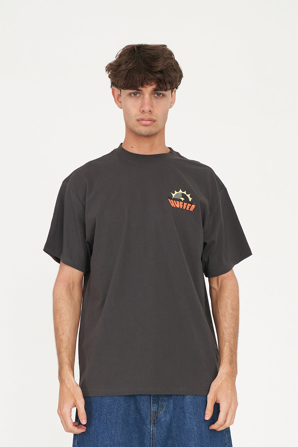 • What you need to know: 100% Cotton, 190gsm, 20mm Neck rib, Classic streetwear fit, Short sleeve, Huffer branded placement screenprint