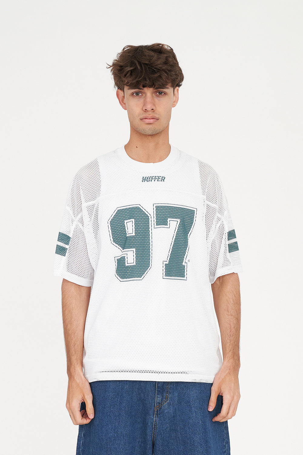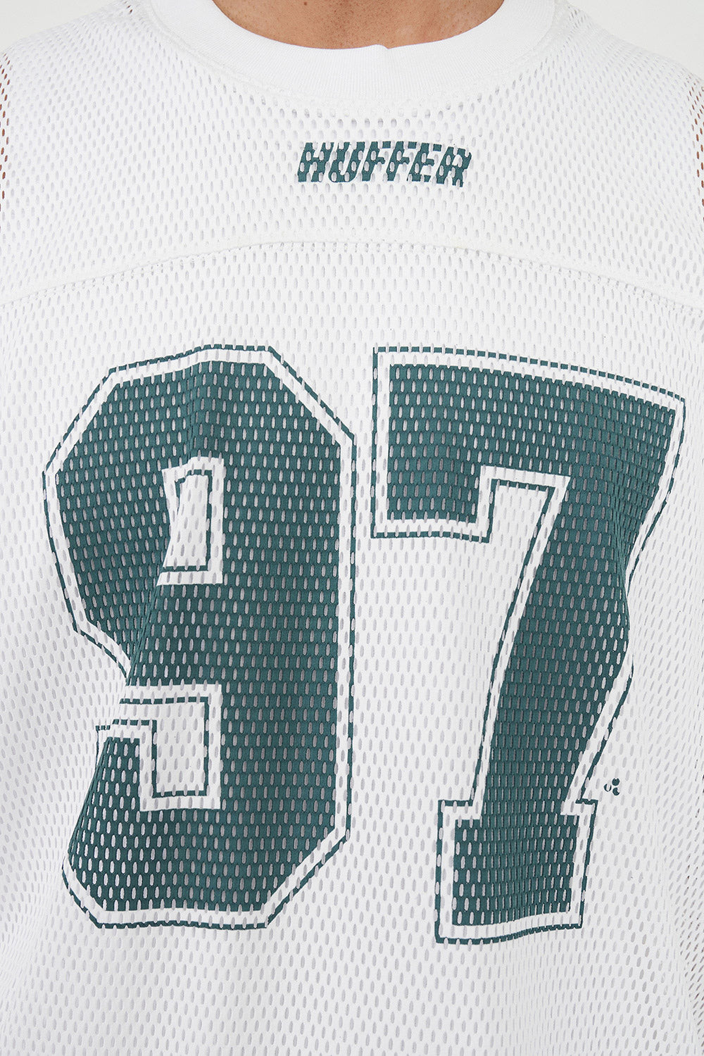 • What you need to know: 100% Polyester Mesh, 155gsm, 25mm Neck rib, Relaxed fit, Short sleeve, Huffer branded placement print