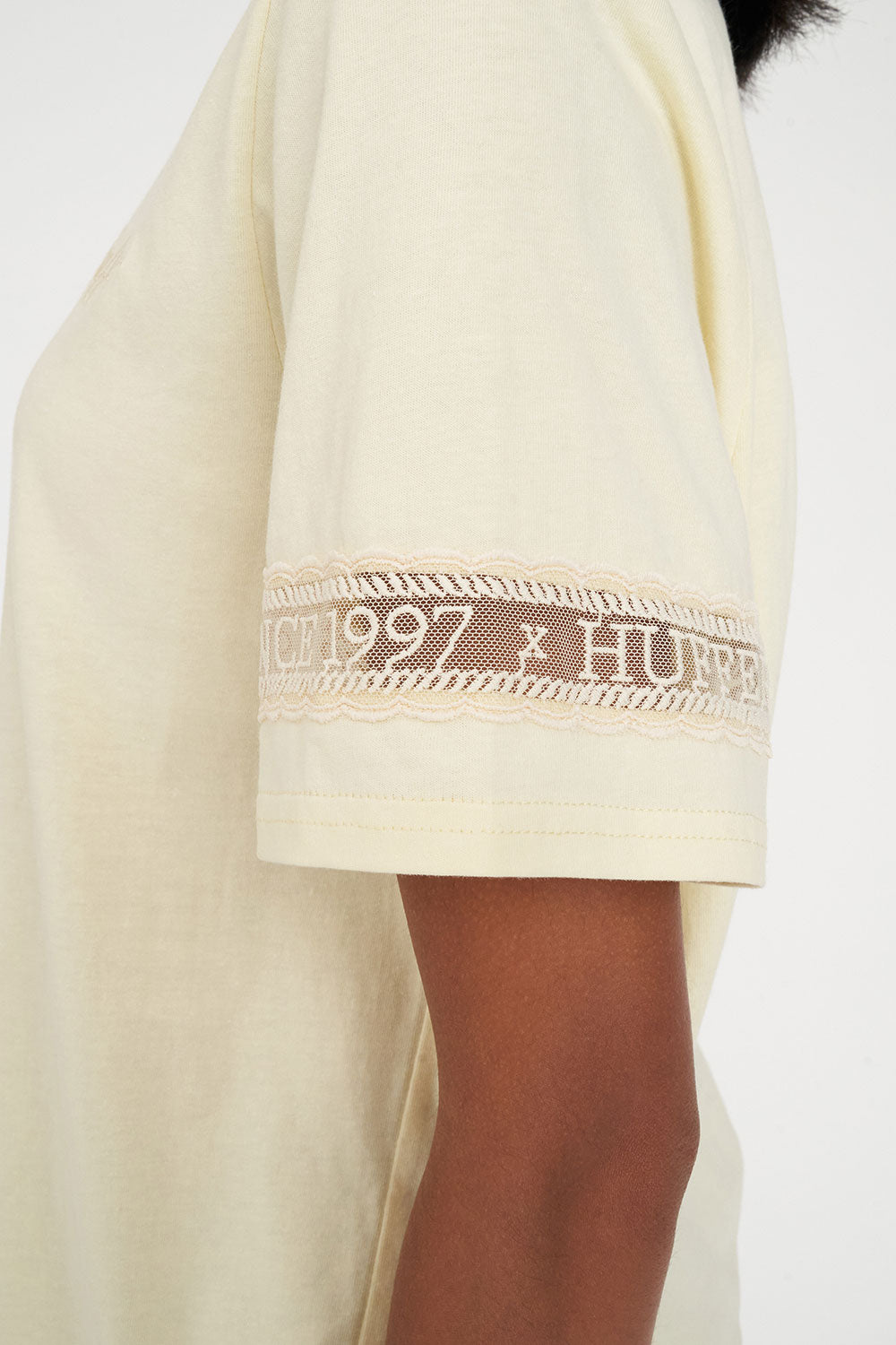 • What you need to know: 100% Cotton, 170gsm, 15mm Neck rib, Lightweight jersey, Custom Huffer piece dyed colour, Classic fit, Short sleeve, Custom Huffer embroidered lace & embroidery
