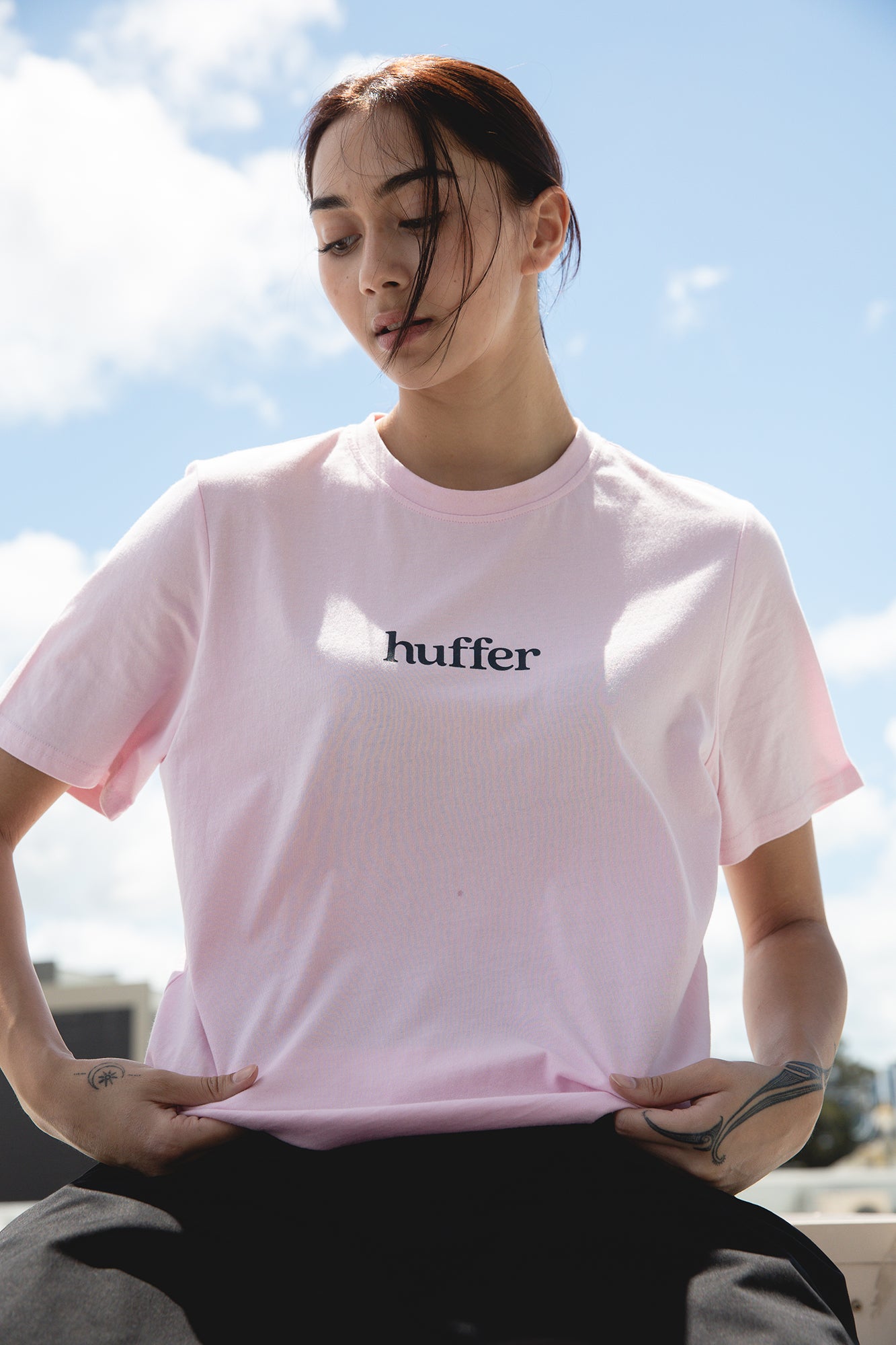 • What you need to know: 100% Cotton, 170gsm, 15mm Neck rib, Light weight jersey, Custom Huffer piece dyed colour, Classic fit, Short sleeve, Huffer branded placement screenprint