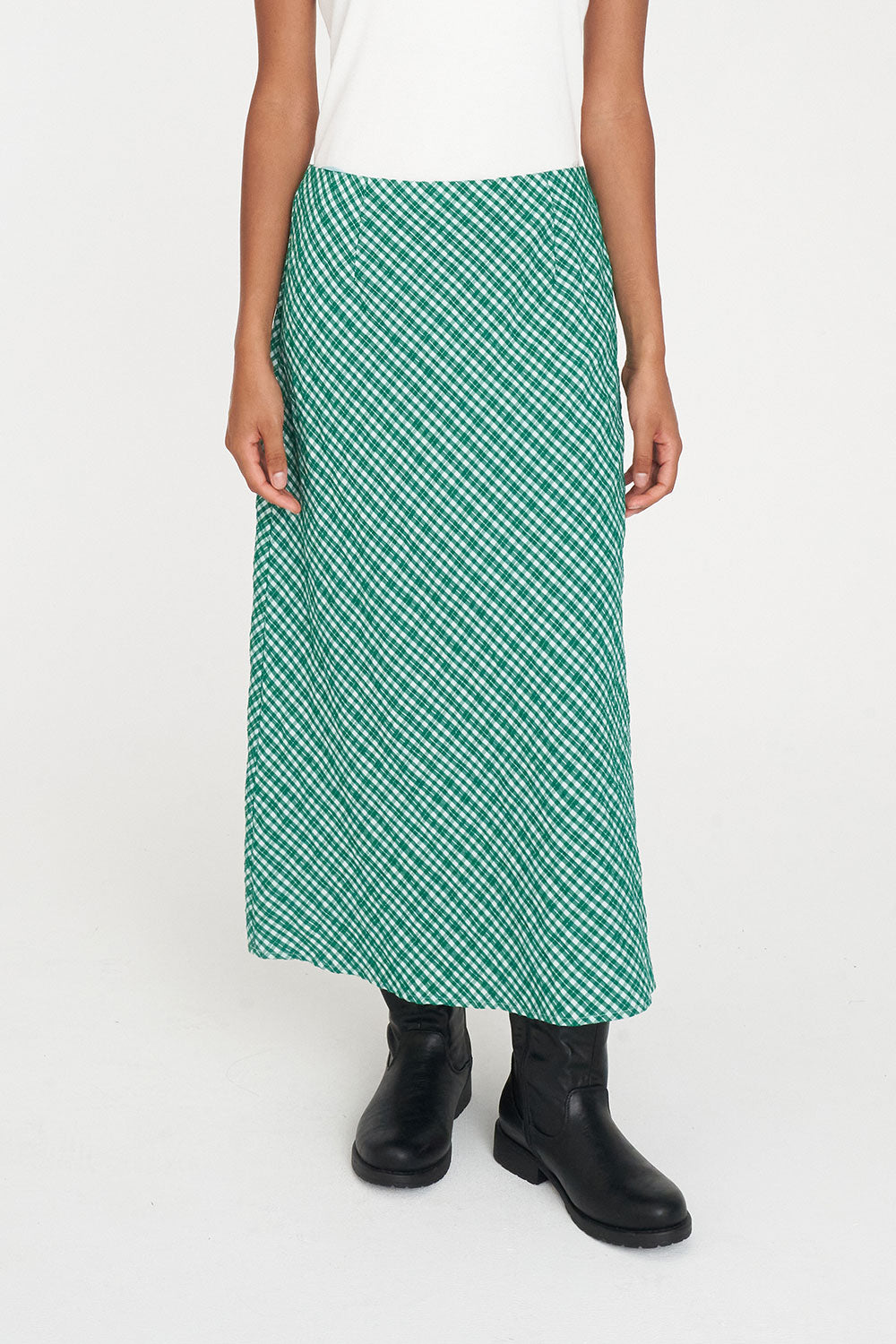 • What you need to know: 67% Cotton 30% Polyester 3% Elastane Gingham, 120gsm, Bias cut, Flared fit, Hidden elasticated waistband, Midi length