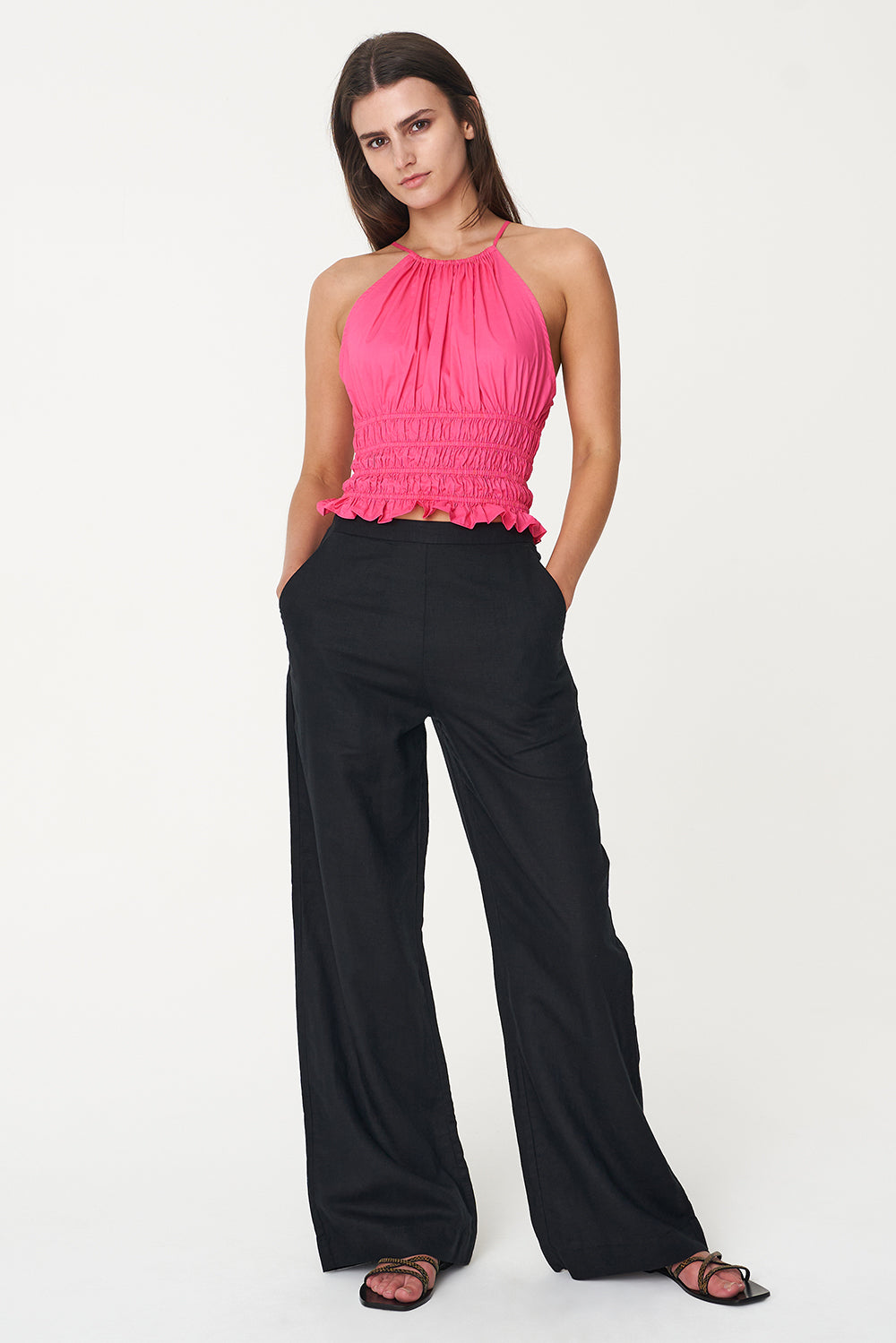 100% Cotton / 92gsm / Fitted / Ruched bodice / Back key hole opening / Adjustable rouleau neckline