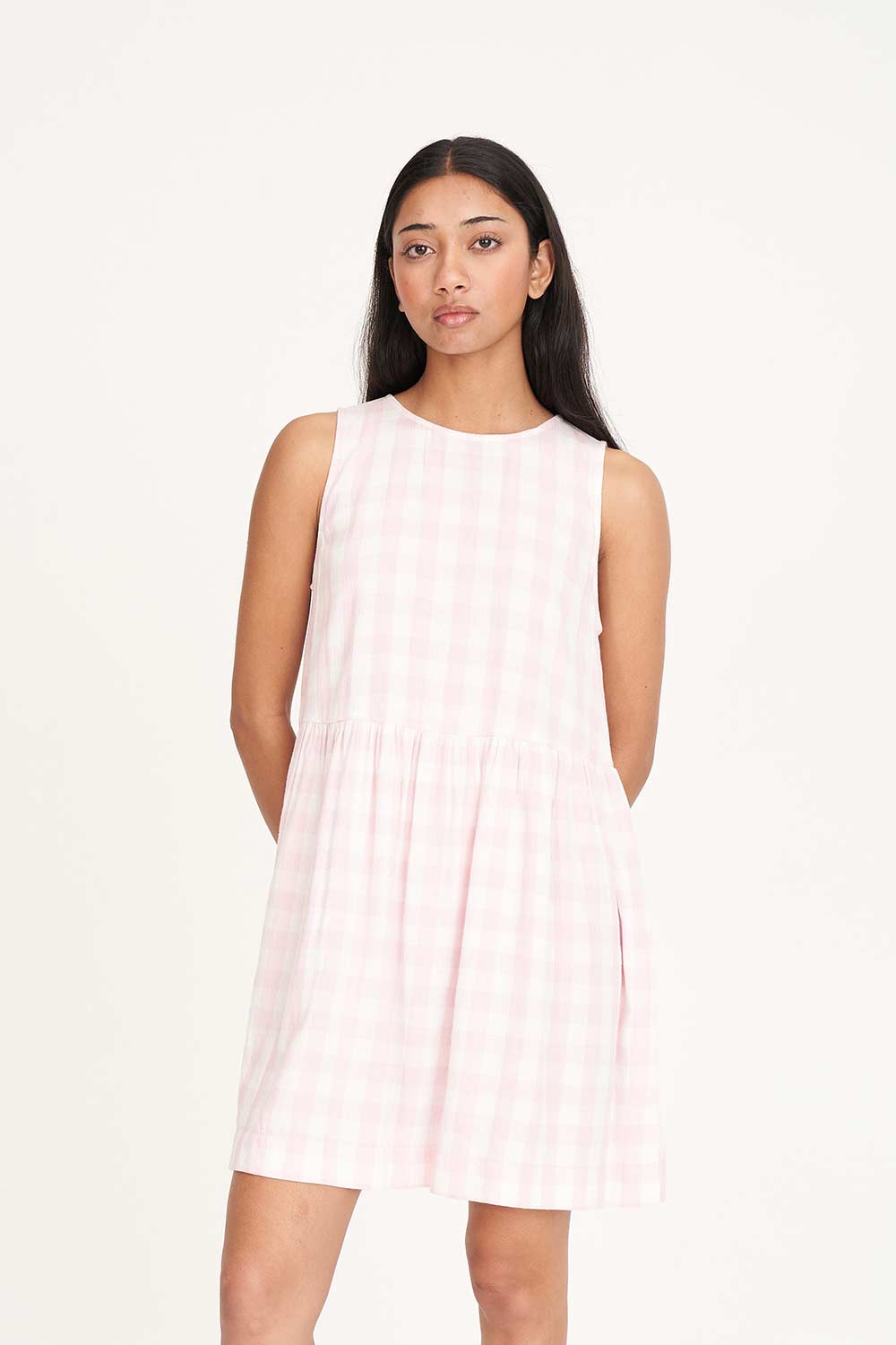 • What you need to know: 110gsm 50% Cotton 50% Rayon, custom Huffer gingham, relaxed fit, sleeveless, drop waist, gathered skirt, side seam pockets, centre back pocket with Huffer branded buttons