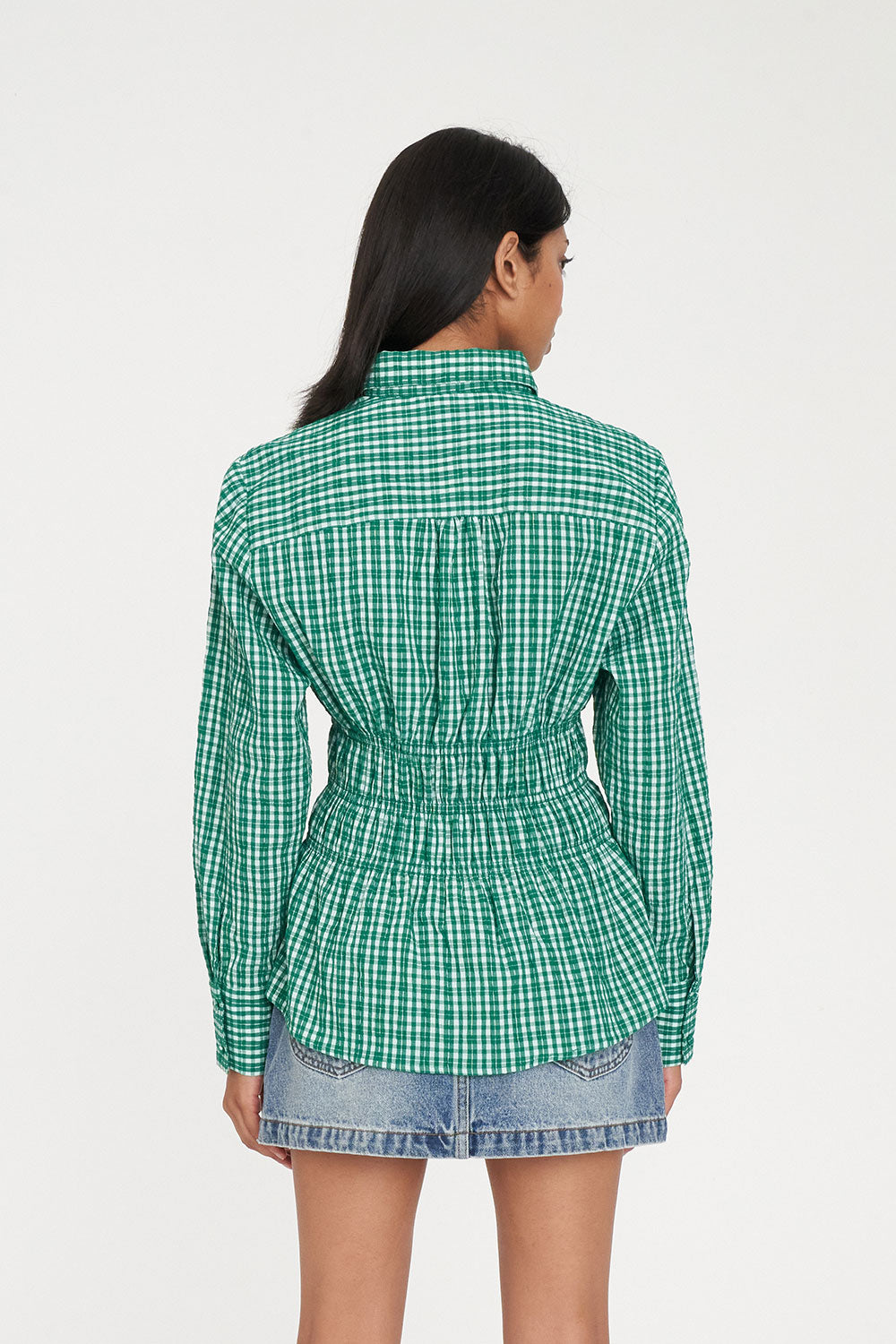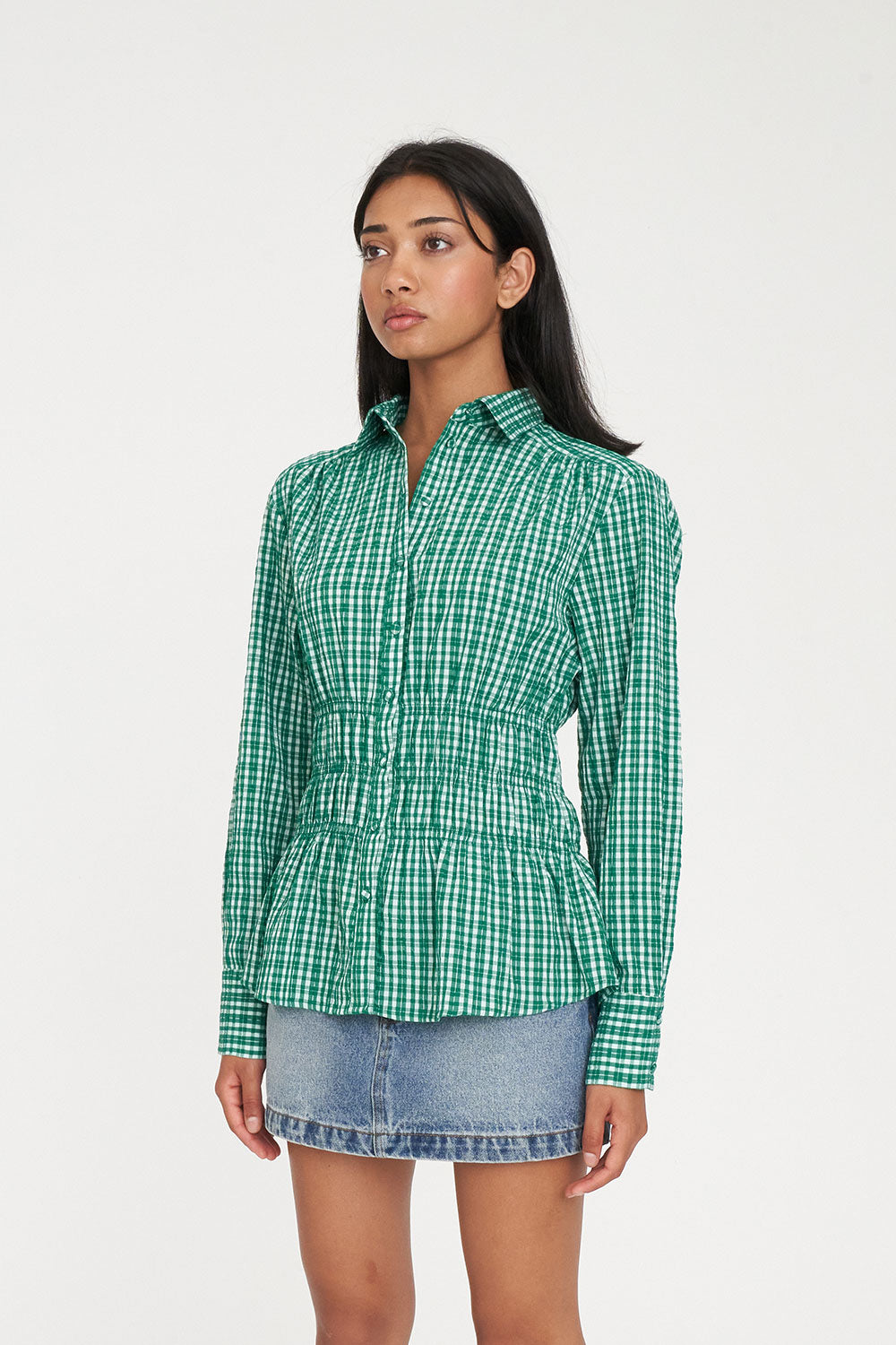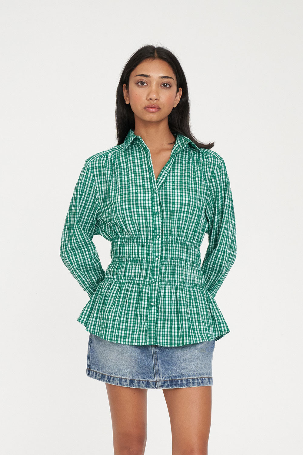 • What you need to know: 67% Cotton 30% Polyester 3% Elastane Gingham, 120gsm, Shirred Waist, Gathered Yoke, Long sleeve, Huffer branded buttons, Trim detail on body and cuffs