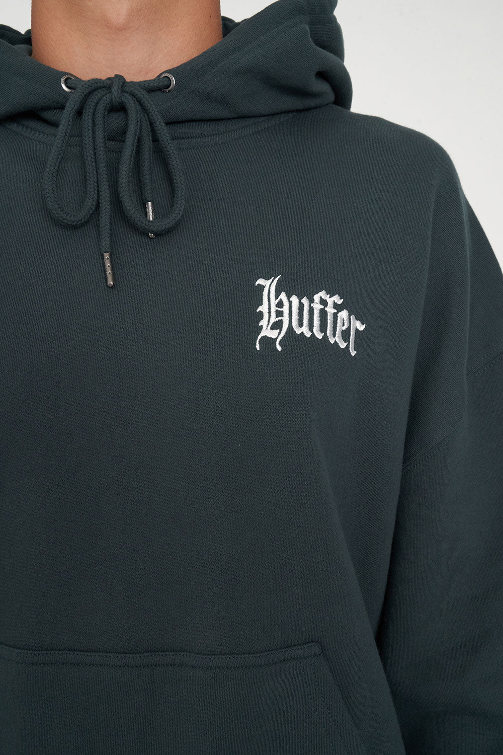 • What you need to know: 100% Cotton, 350gsm, Mid-weight brushback fleece, Custom Huffer colour, Boxy fit, Kangaroo pocket, Huffer branded hardware, Huffer branded placement embroidery