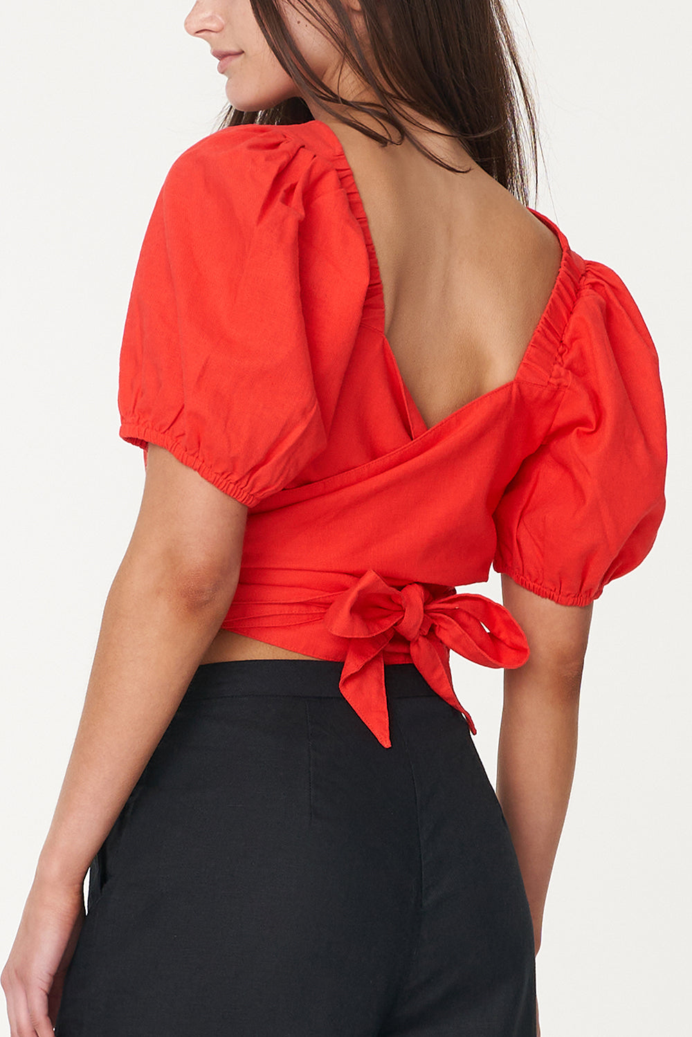 55% Linen 45% Cotton / 150gsm / Cropped length / Elasticated waist / Back wrap tie detail / Reversible / Puff sleeve