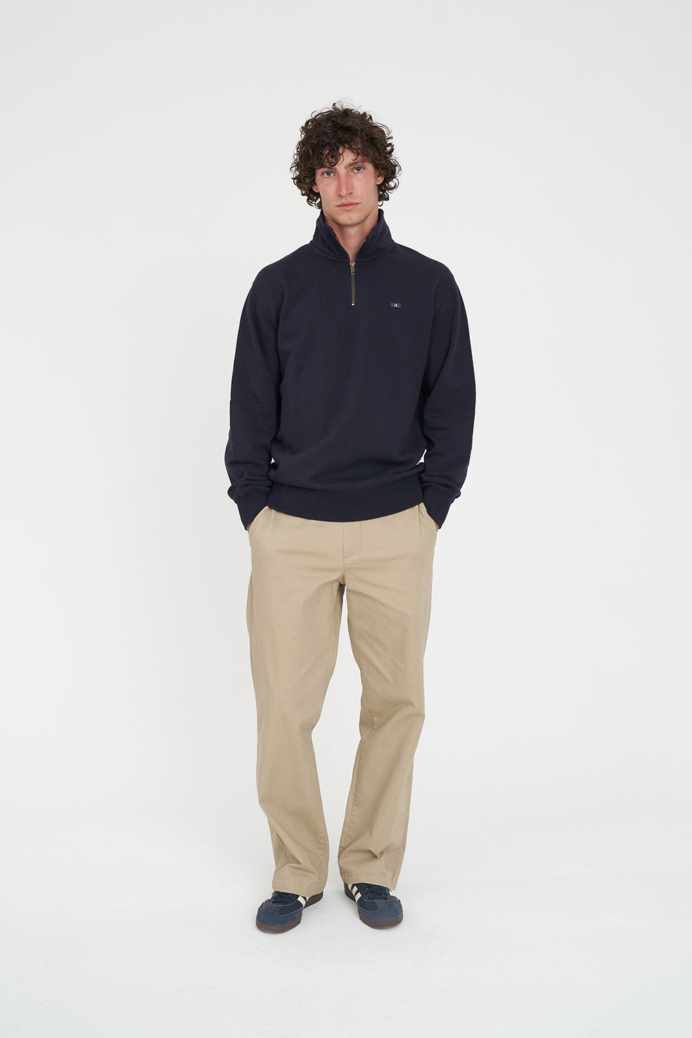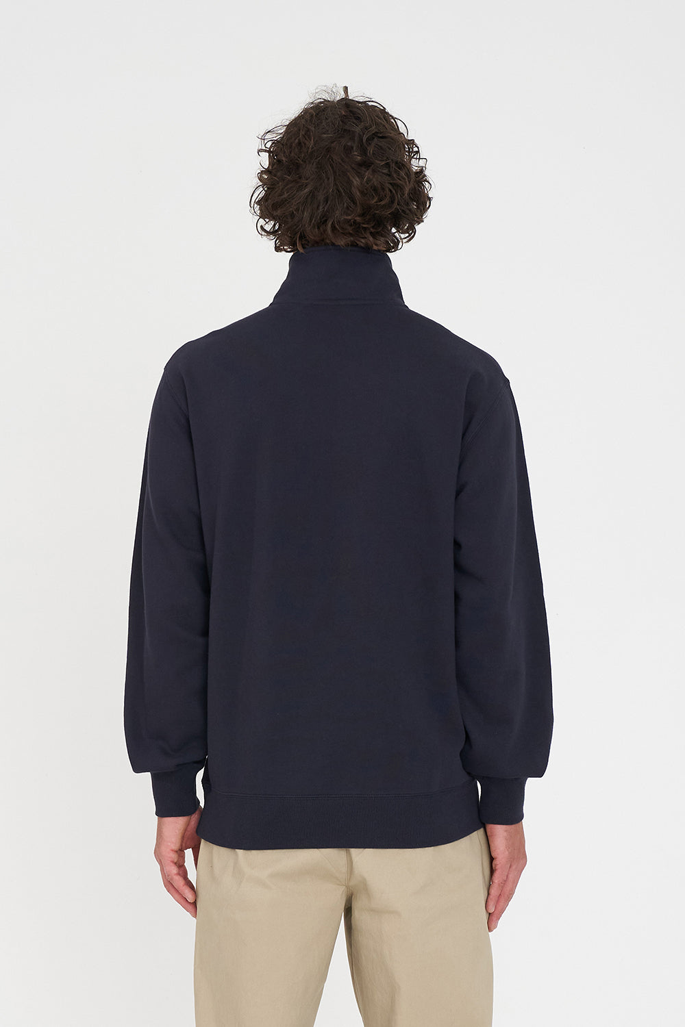 • What you need to know: 100% Cotton, 350gsm, Mid-weight brushback fleece, Contrast panels, High neck with zip opening, Classic fit, Rib hem, Huffer branded embroidery badge