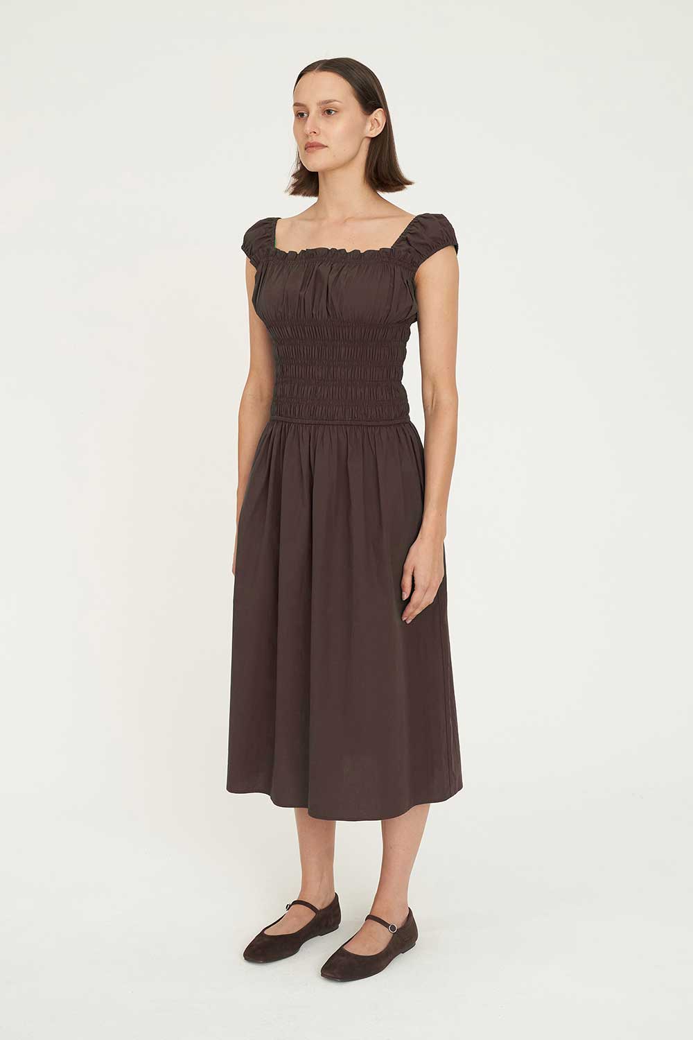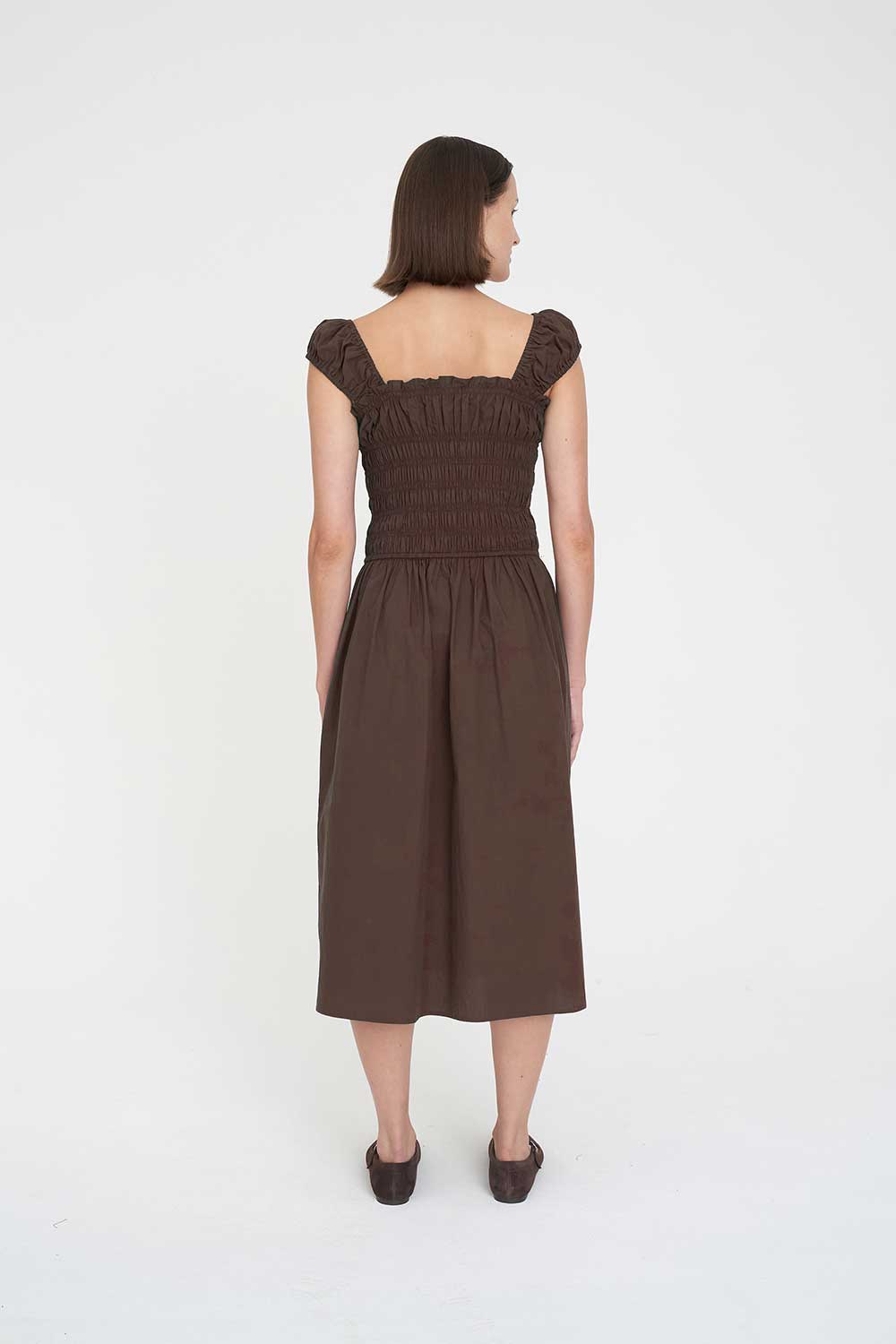 • What you need to know: 100% Cotton Poplin, 110gsm, Gathered shoulder straps, Square gathered neckline with ruffle detail, Shirred bodice, Midi length, Side seam pockets