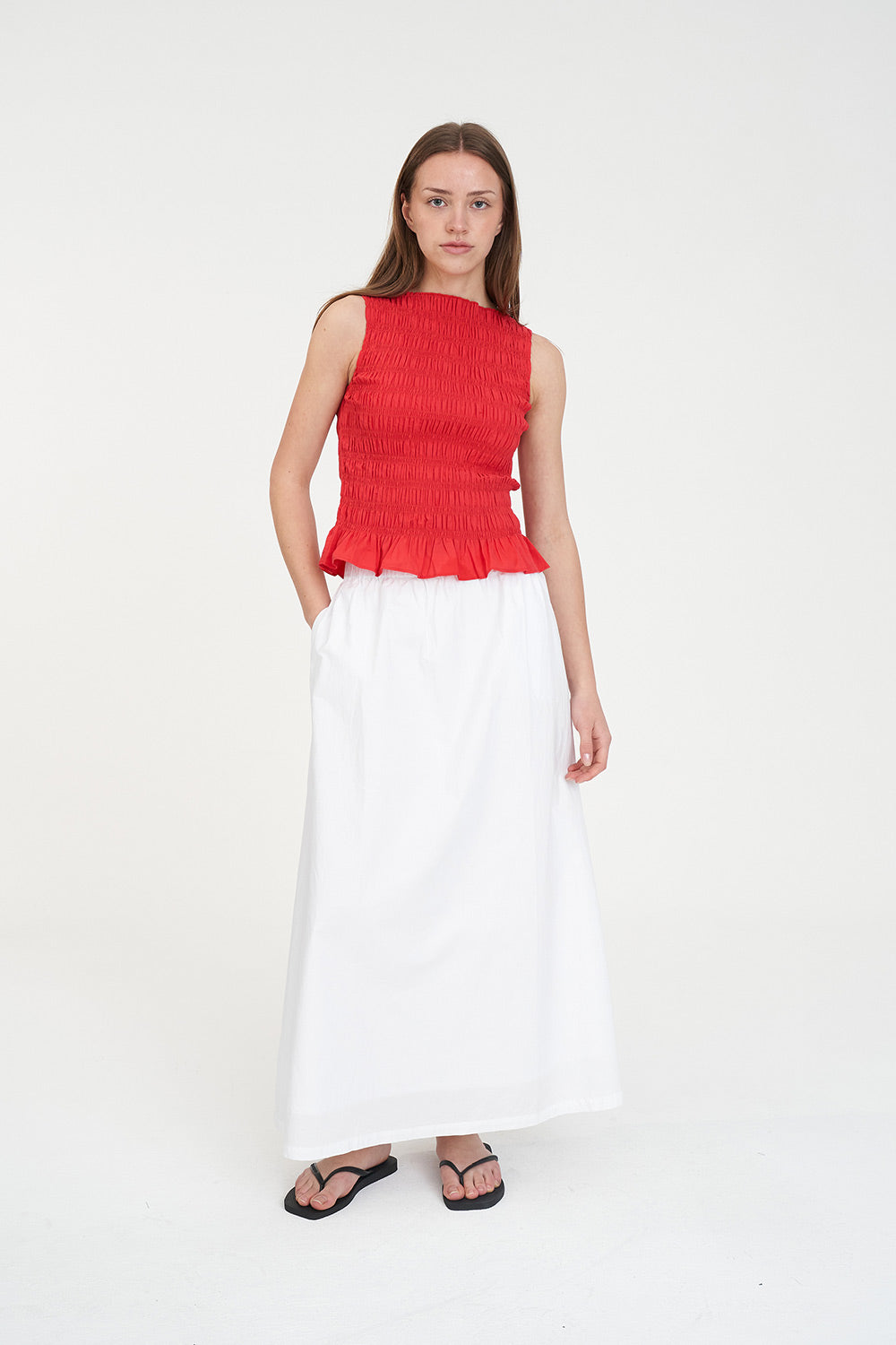 • What you need to know: 100% Cotton, 110gsm, Crew neckline, Sleeveless, Shirred bodice, Hem ruffle, Huffer branded placement embroidery