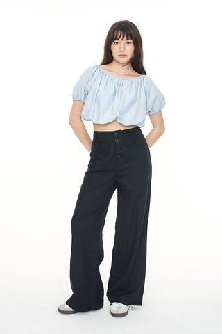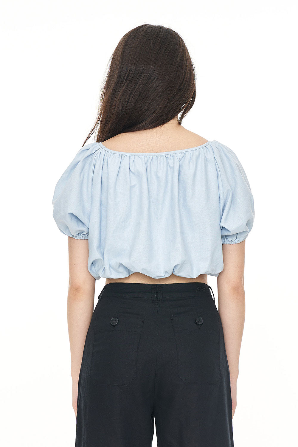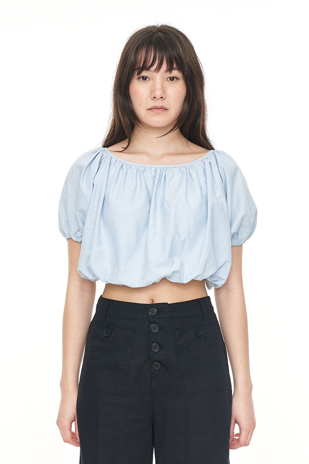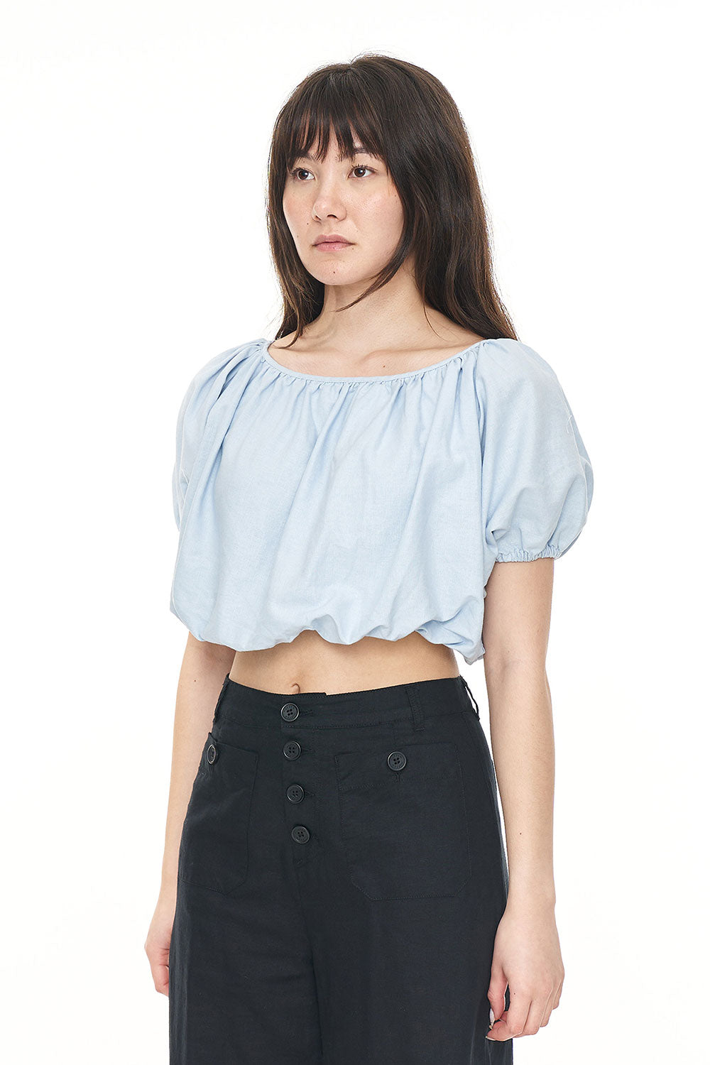55% Linen 45% Cotton / 200gsm / Custom Huffer colour/ Loose fitting / Adjustable drawcord neckline / Short puff sleeve / Elasicated sleeve hem / Crop length / Bubble hem construction