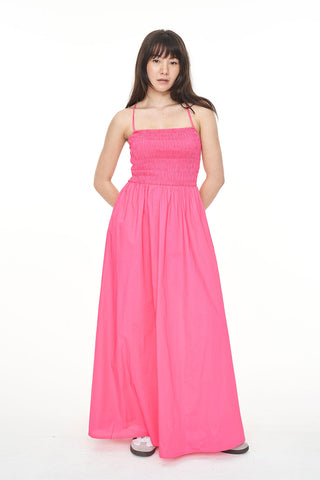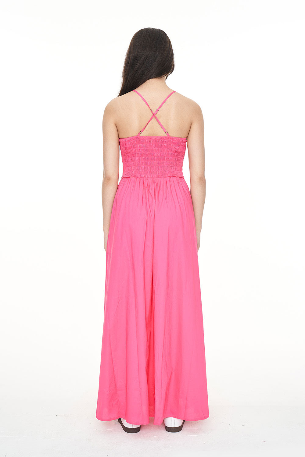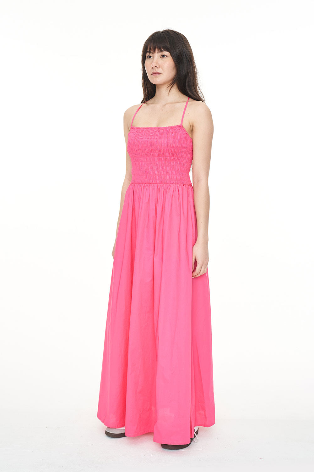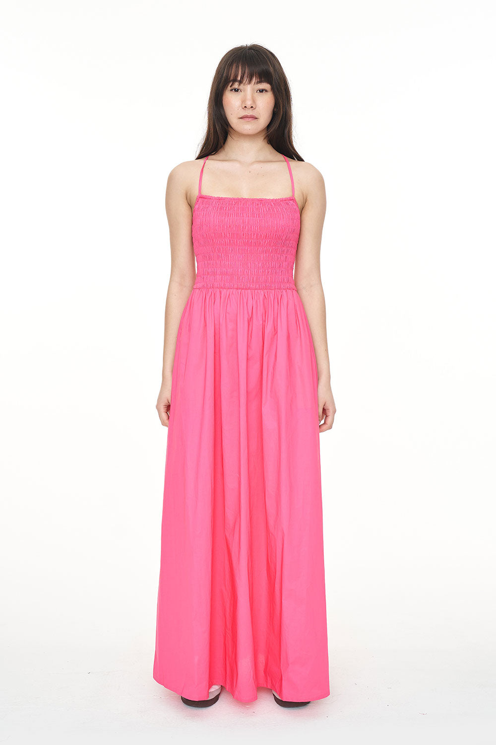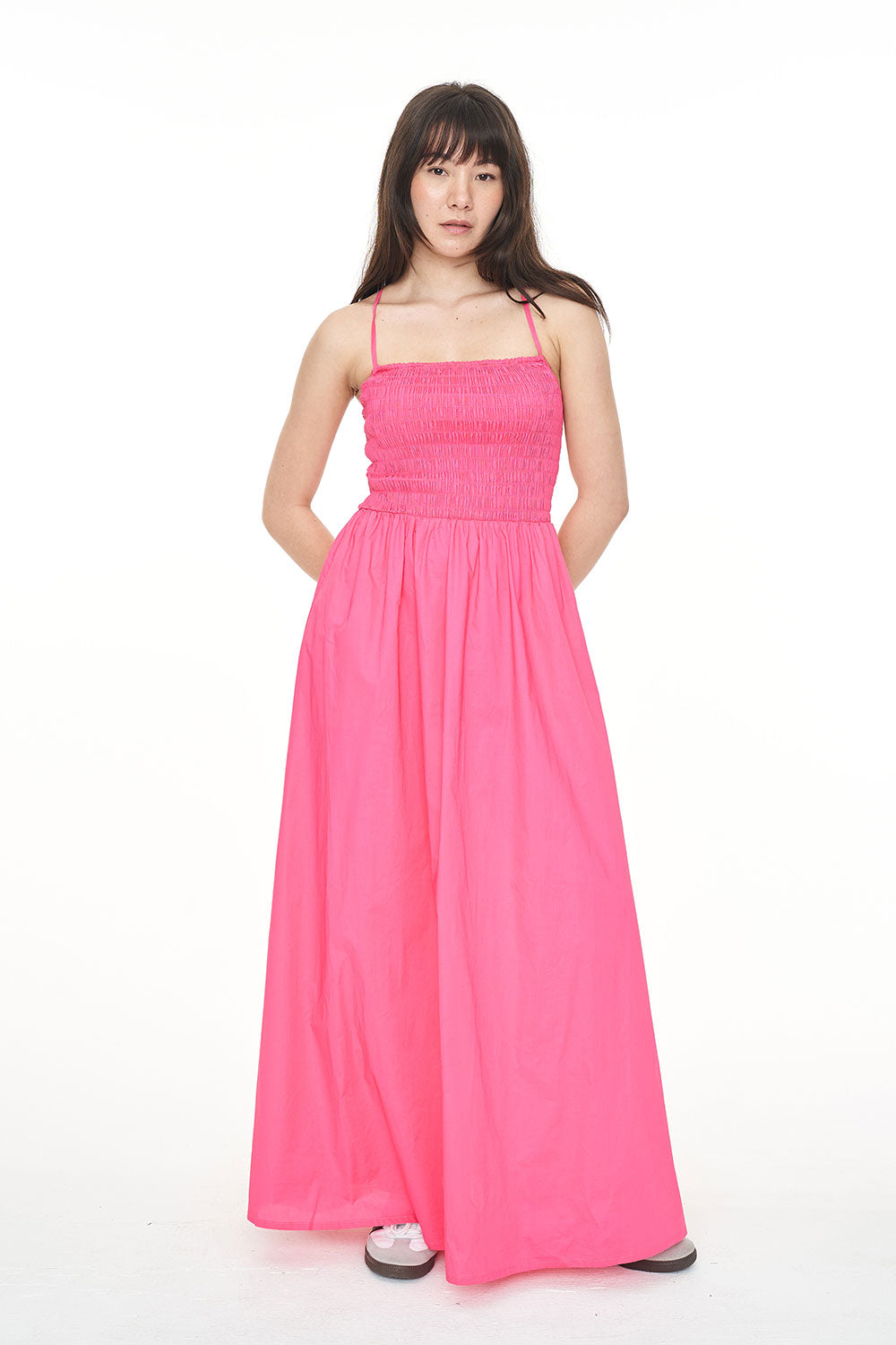 100% Cotton / 110gsm / Maxi length / Shirred bodice / Open back with adjustable crossover ties / Concealed side seam pockets