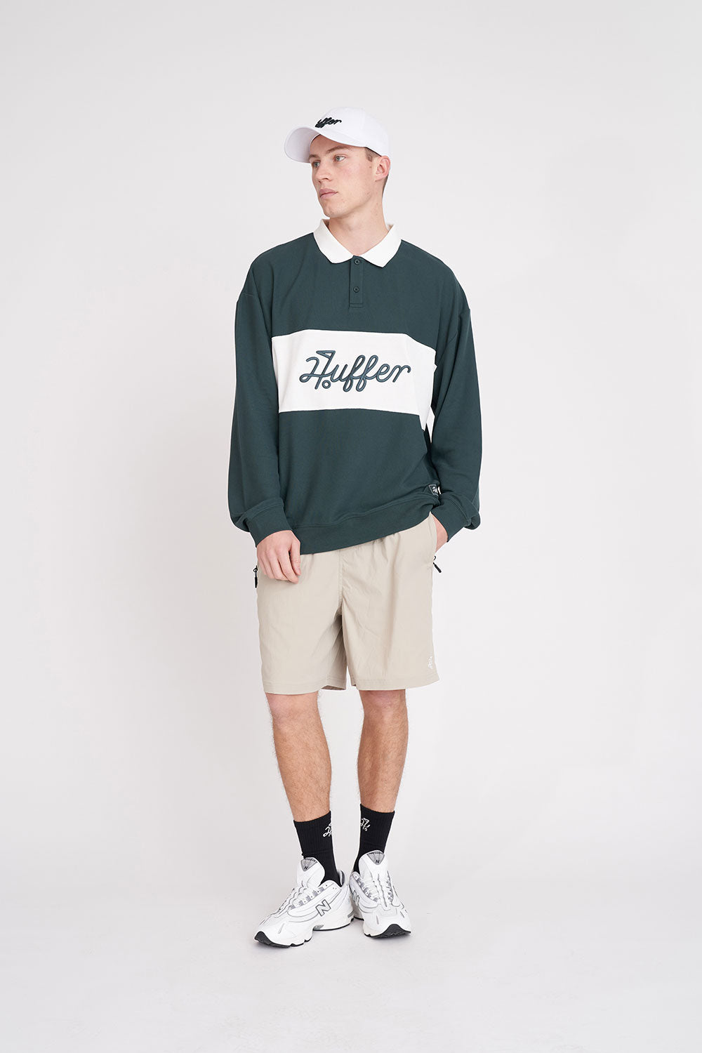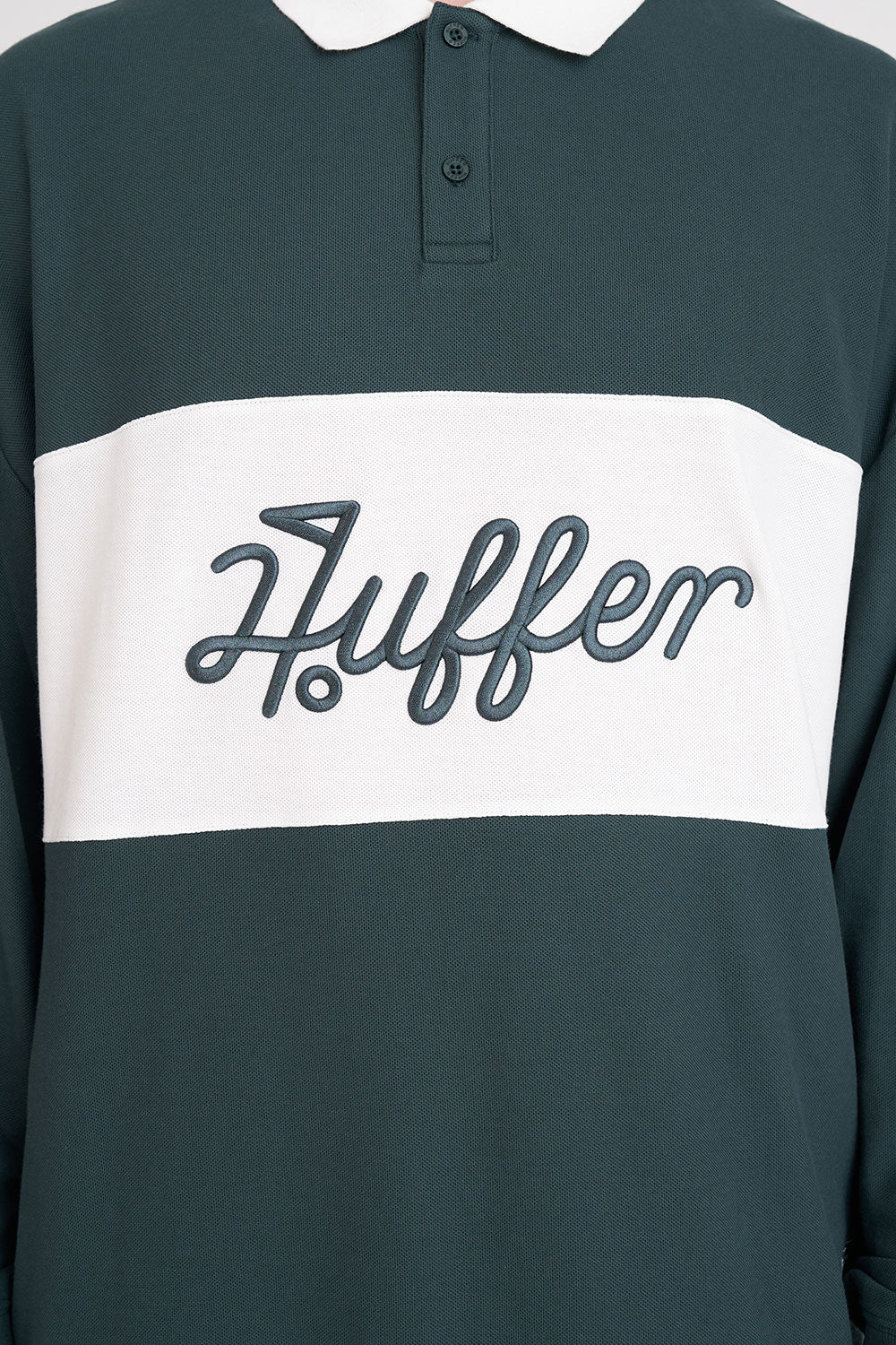 • Here’s what you should know: Performance Rugy Polo keeps your game sharp, and your off duty look sharper. 60% cotton 40% polyester pique – a soft cotton-poly pique with a boxy streetwear fit this crew brings classic golf details like a centre front button placket and ribbed collar into a relaxed, street-ready package. With contrast front paneling and custom Huffer embroidery, it’s built to perform whether you’re sinking putts or sinking pints.