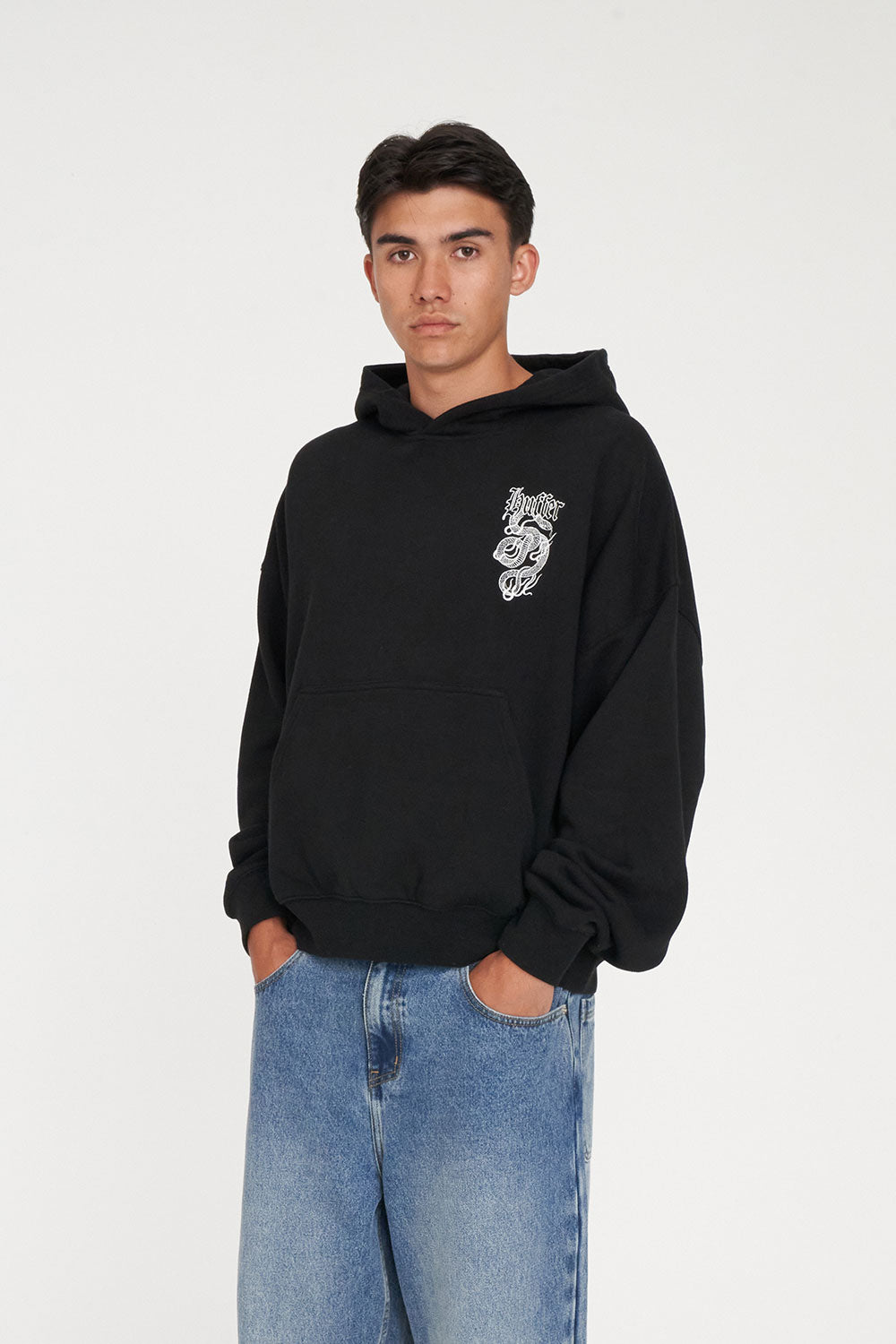 • What you need to know: 100% Cotton, 350gsm, Mid-weight brushback fleece, Custom Huffer colour, Boxy cropped fit, Kangaroo pocket, Huffer branded hardware / Huffer branded placement embroid